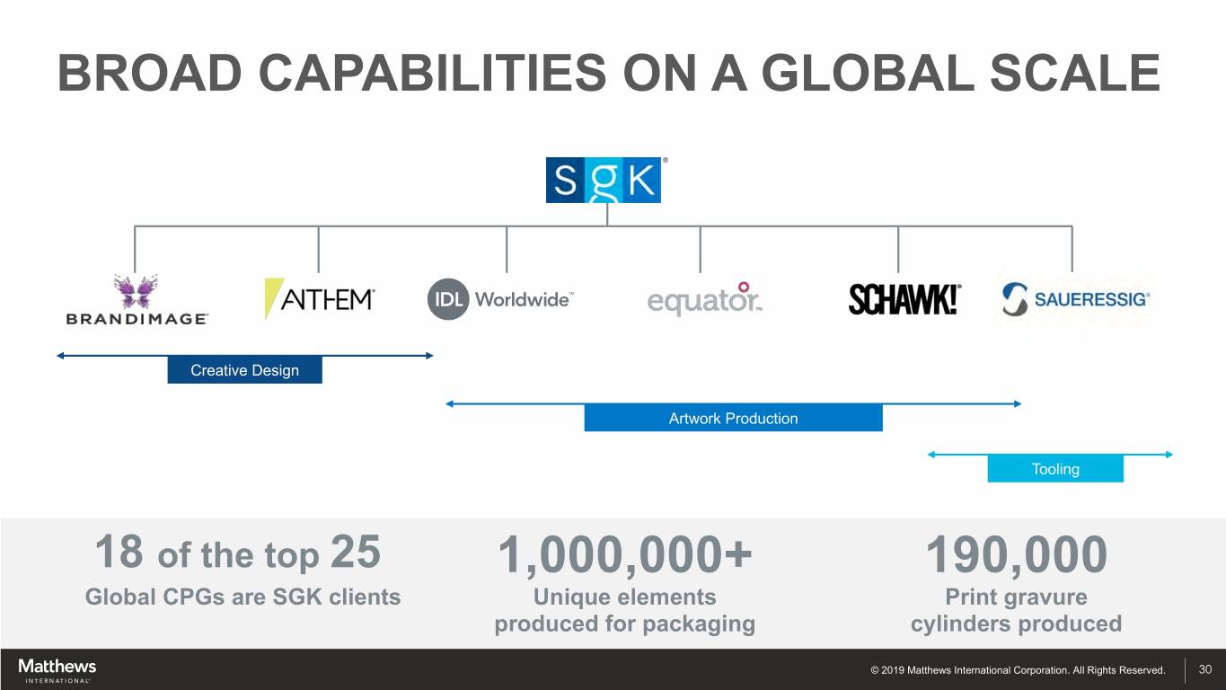 BROAD CAPABILITIES ON A GLOBAL SCALE Creative Design Artwork Production Tooling 18 of the top 25 1,000,000+ 190,000 Global CPGs are SGK clients Unique elements Print gravure produced for packaging cylinders produced © 2019 Matthews International Corporation. All Rights Reserved. 30