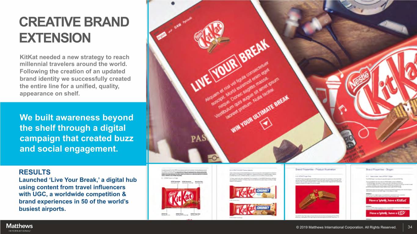 CREATIVE BRAND EXTENSION KitKat needed a new strategy to reach millennial travelers around the world. Following the creation of an updated brand identity we successfully created the entire line for a unified, quality, appearance on shelf. We built awareness beyond the shelf through a digital campaign that created buzz and social engagement. RESULTS Launched ‘Live Your Break,’ a digital hub using content from travel influencers with UGC, a worldwide competition & brand experiences in 50 of the world’s busiest airports. © 2019 Matthews International Corporation. All Rights Reserved. 34