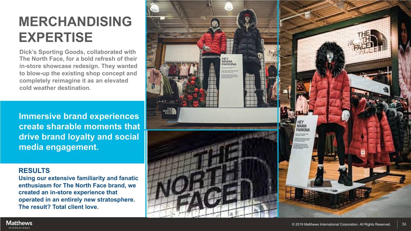 MERCHANDISING EXPERTISE Dick’s Sporting Goods, collaborated with The North Face, for a bold refresh of their in-store showcase redesign. They wanted to blow-up the existing shop concept and completely reimagine it as an elevated cold weather destination. Immersive brand experiences create sharable moments that drive brand loyalty and social media engagement. RESULTS Using our extensive familiarity and fanatic enthusiasm for The North Face brand, we created an in-store experience that operated in an entirely new stratosphere. The result? Total client love. © 2019 Matthews International Corporation. All Rights Reserved. 36