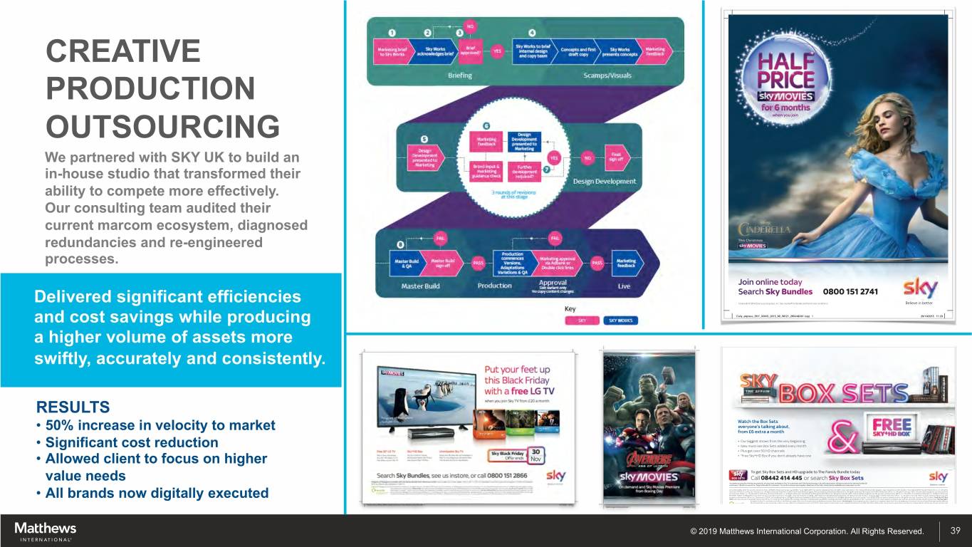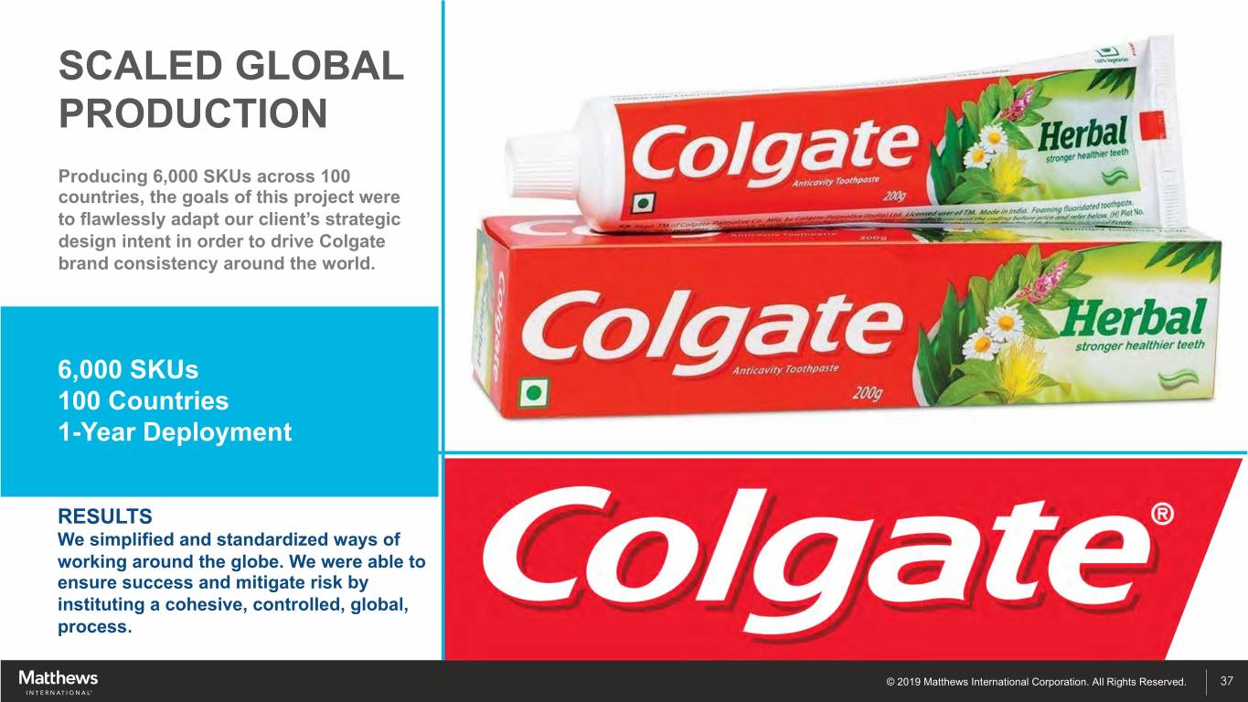 SCALED GLOBAL PRODUCTION Producing 6,000 SKUs across 100 countries, the goals of this project were to flawlessly adapt our client’s strategic design intent in order to drive Colgate brand consistency around the world. 6,000 SKUs 100 Countries 1-Year Deployment RESULTS We simplified and standardized ways of working around the globe. We were able to ensure success and mitigate risk by instituting a cohesive, controlled, global, process. © 2019 Matthews International Corporation. All Rights Reserved. 37