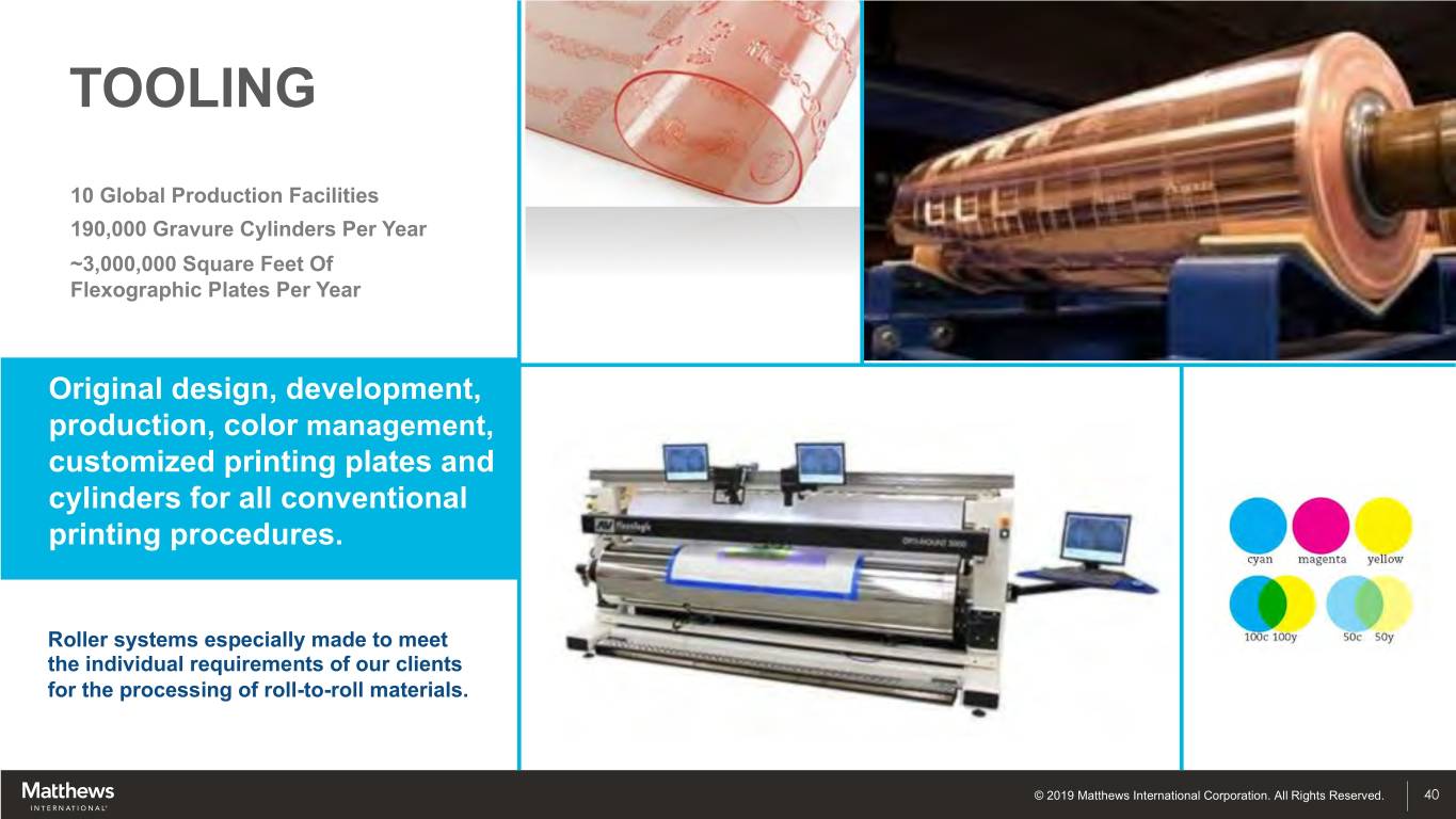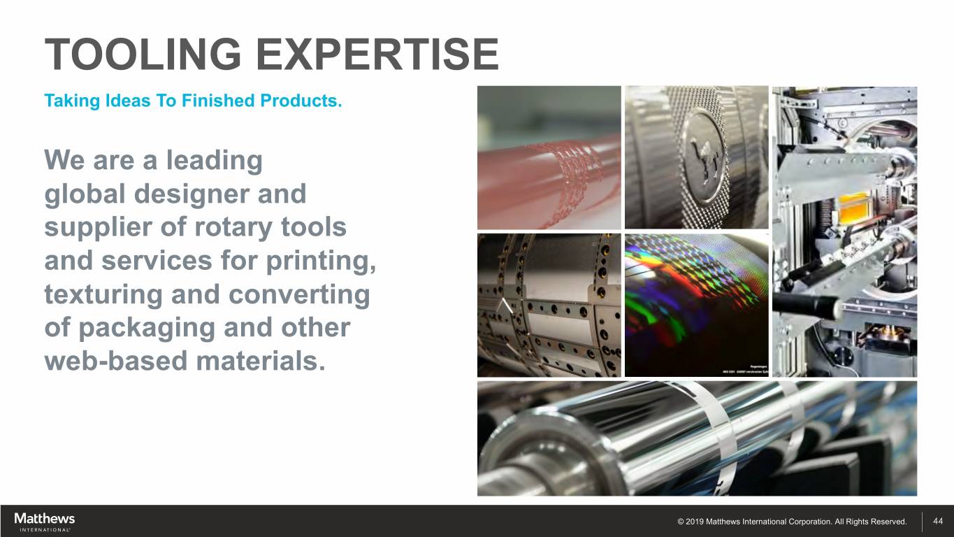 TOOLING EXPERTISE Taking Ideas To Finished Products. We are a leading global designer and supplier of rotary tools and services for printing, texturing and converting of packaging and other web-based materials. © 2019 Matthews International Corporation. All Rights Reserved. 44