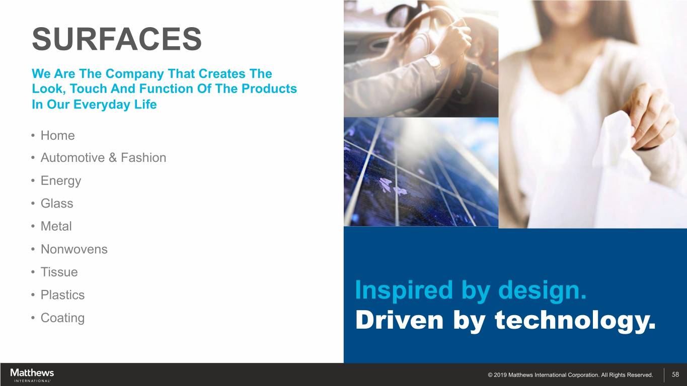 SURFACES We Are The Company That Creates The Look, Touch And Function Of The Products In Our Everyday Life • Home • Automotive & Fashion • Energy • Glass • Metal • Nonwovens • Tissue • Plastics Inspired by design. • Coating Driven by technology. © 2019 Matthews International Corporation. All Rights Reserved. 58