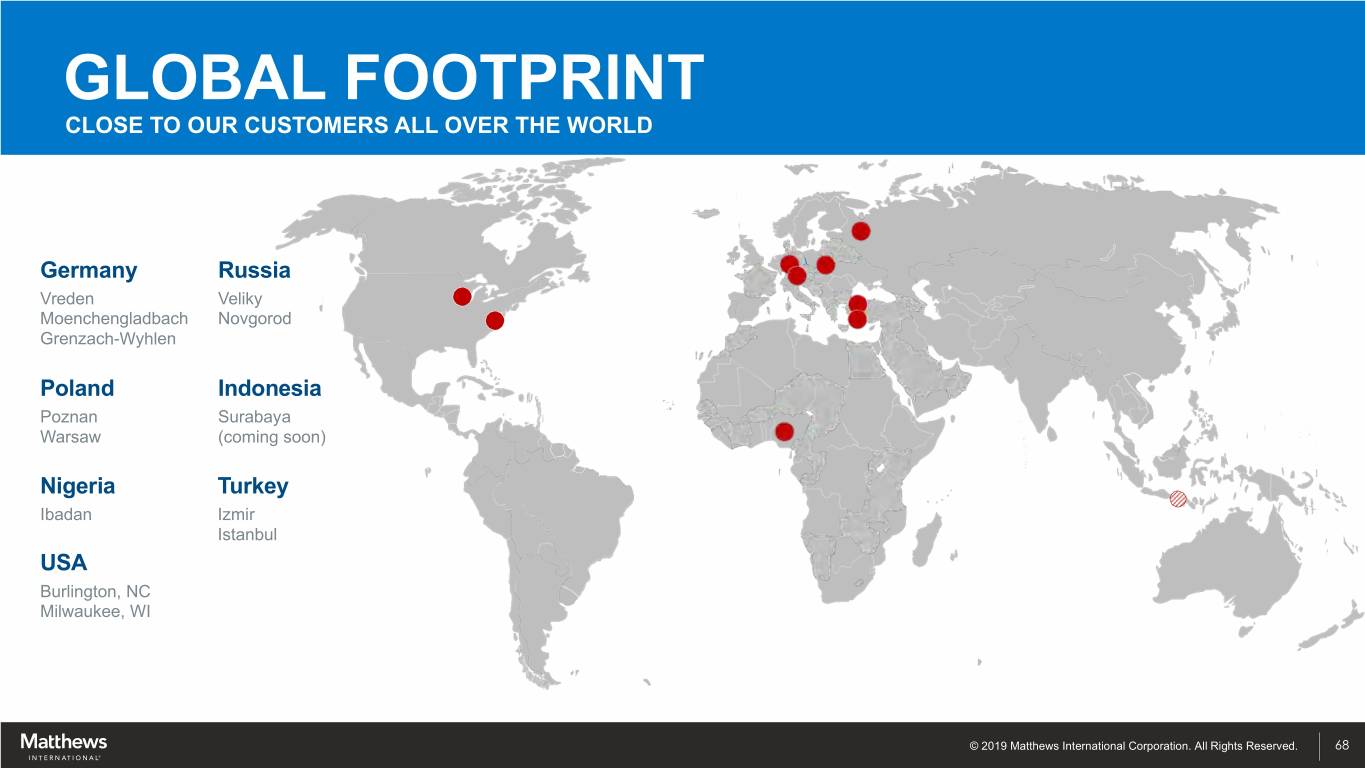 GLOBAL FOOTPRINT CLOSE TO OUR CUSTOMERS ALL OVER THE WORLD Germany Russia Vreden Veliky Moenchengladbach Novgorod Grenzach-Wyhlen Poland Indonesia Poznan Surabaya Warsaw (coming soon) Nigeria Turkey Ibadan Izmir Istanbul USA Burlington, NC Milwaukee, WI © 2019 Matthews International Corporation. All Rights Reserved. 68