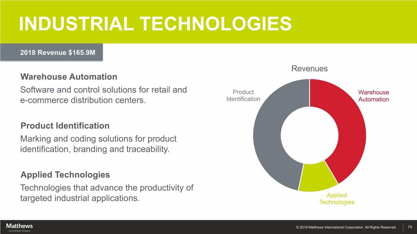 INDUSTRIAL TECHNOLOGIES 2018 Revenue $165.9M Revenues Warehouse Automation Software and control solutions for retail and Product Warehouse e-commerce distribution centers. Identification Automation Product Identification Marking and coding solutions for product identification, branding and traceability. Applied Technologies Technologies that advance the productivity of Applied targeted industrial applications. Technologies © 2019 Matthews International Corporation. All Rights Reserved. 74