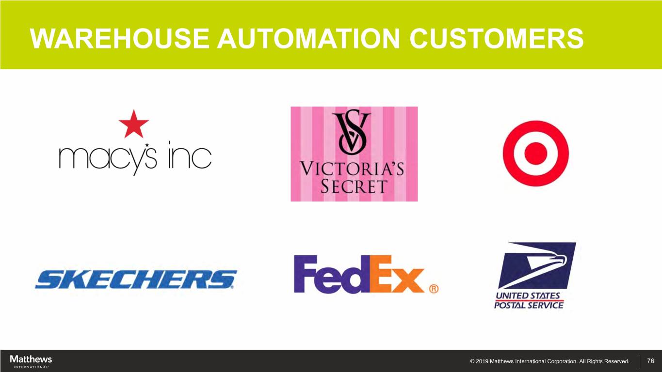 WAREHOUSE AUTOMATION CUSTOMERS © 2019 Matthews International Corporation. All Rights Reserved. 76