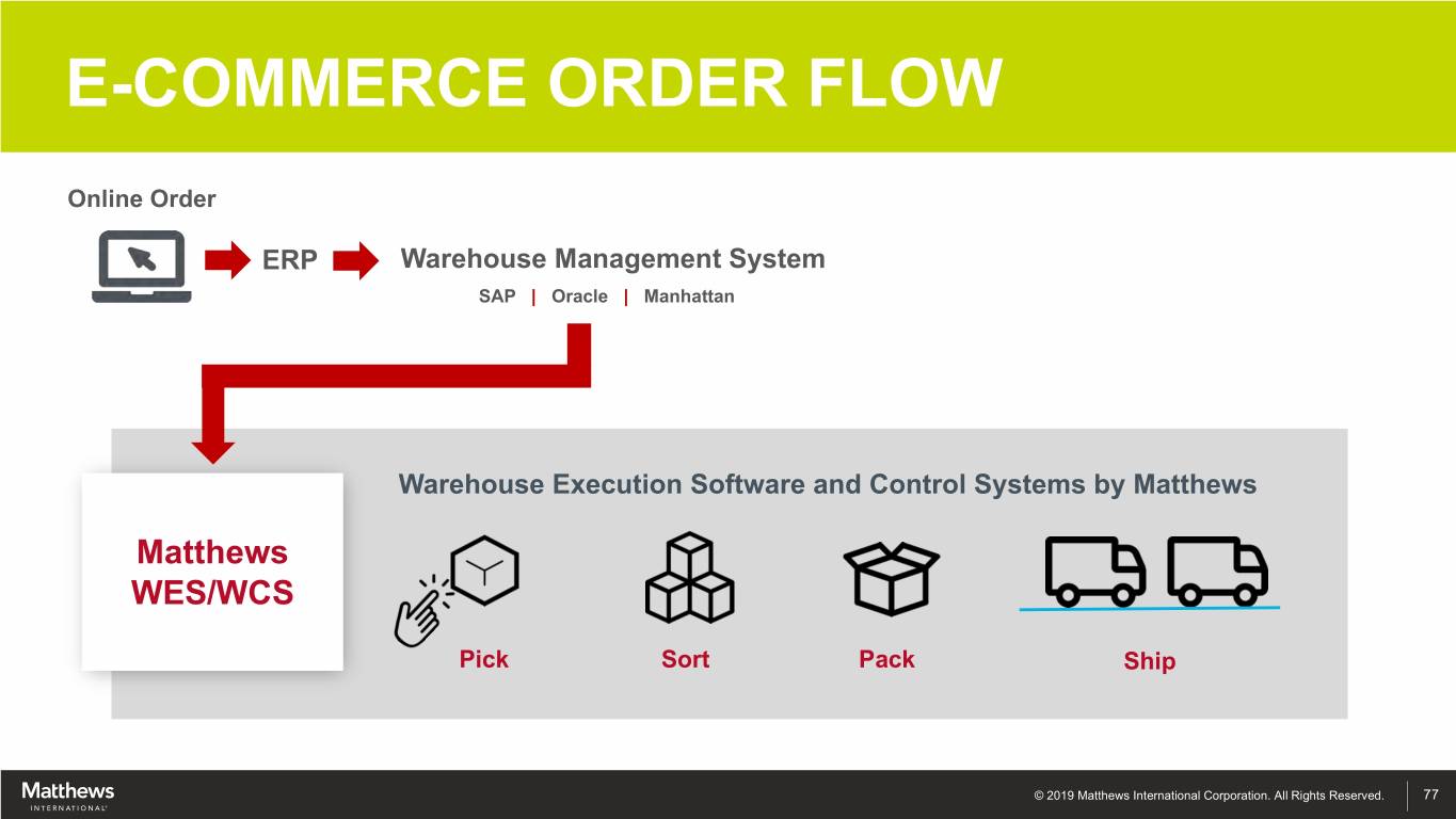 E-COMMERCE ORDER FLOW Online Order ERP Warehouse Management System SAP | Oracle | Manhattan Warehouse Execution Software and Control Systems by Matthews Matthews WES/WCS Pick Sort Pack Ship © 2019 Matthews International Corporation. All Rights Reserved. 77