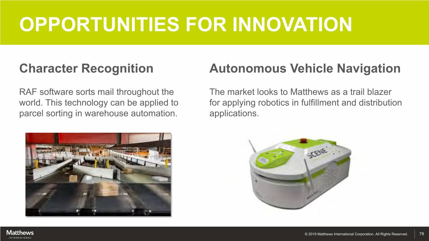 OPPORTUNITIES FOR INNOVATION Character Recognition Autonomous Vehicle Navigation RAF software sorts mail throughout the The market looks to Matthews as a trail blazer world. This technology can be applied to for applying robotics in fulfillment and distribution parcel sorting in warehouse automation. applications. © 2019 Matthews International Corporation. All Rights Reserved. 78