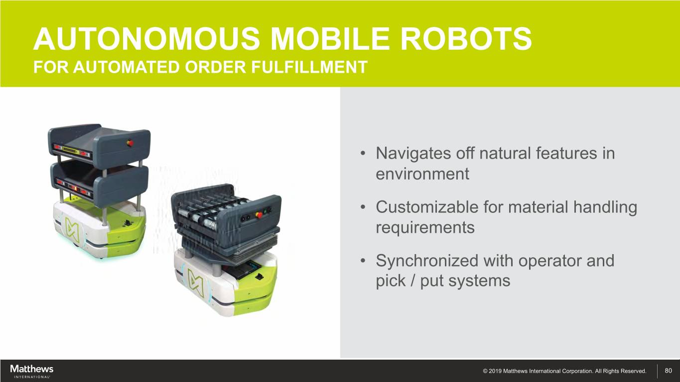 AUTONOMOUS MOBILE ROBOTS FOR AUTOMATED ORDER FULFILLMENT • Navigates off natural features in environment • Customizable for material handling requirements • Synchronized with operator and pick / put systems © 2019 Matthews International Corporation. All Rights Reserved. 80