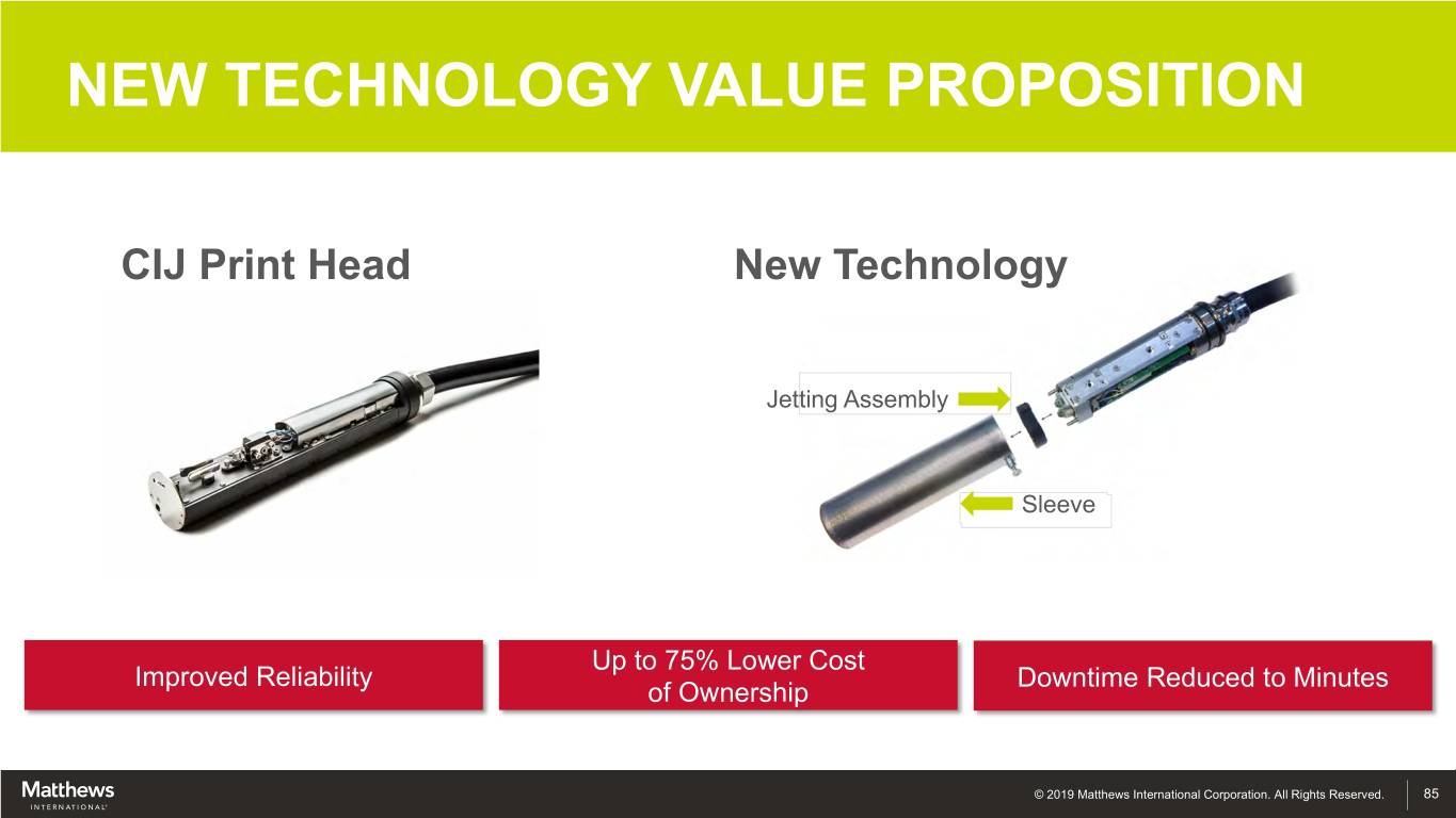 NEW TECHNOLOGY VALUE PROPOSITION CIJ Print Head New Technology Jetting Assembly Sleeve Up to 75% Lower Cost Improved Reliability Downtime Reduced to Minutes of Ownership © 2019 Matthews International Corporation. All Rights Reserved. 85