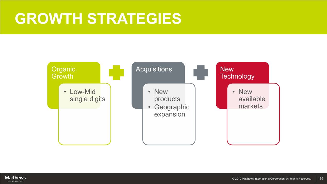 GROWTH STRATEGIES Organic Acquisitions New Growth TheTechnology Opportunity $1.8 Billion • Low-Mid • New • New single digits products available • Geographic markets expansion © 2019 Matthews International Corporation. All Rights Reserved. 86