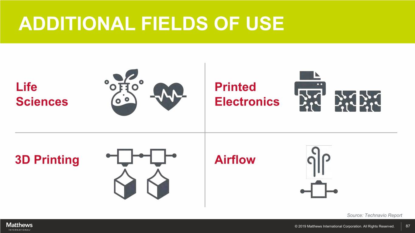 ADDITIONAL FIELDS OF USE Life Printed The Opportunity Sciences Electronics $1.8 Billion 3D Printing Airflow Source: Technavio Report © 2019 Matthews International Corporation. All Rights Reserved. 87