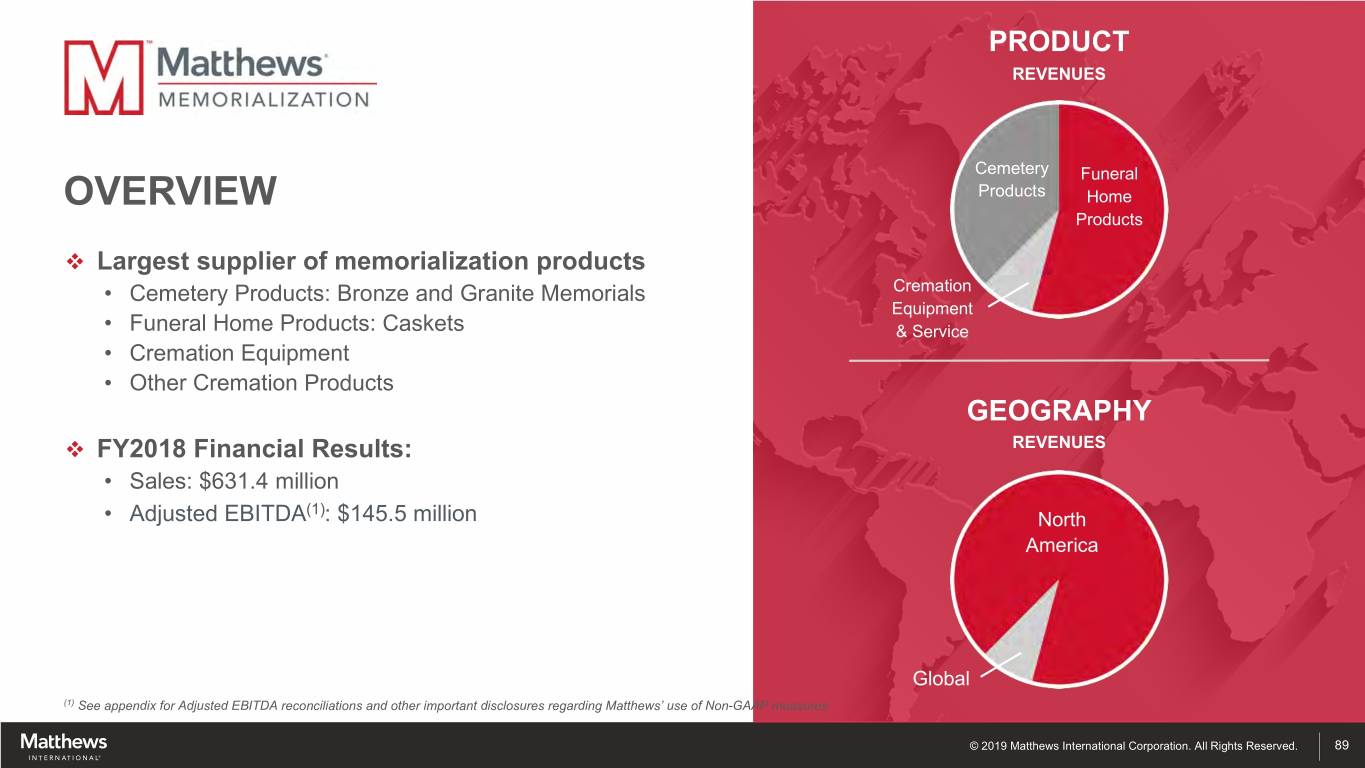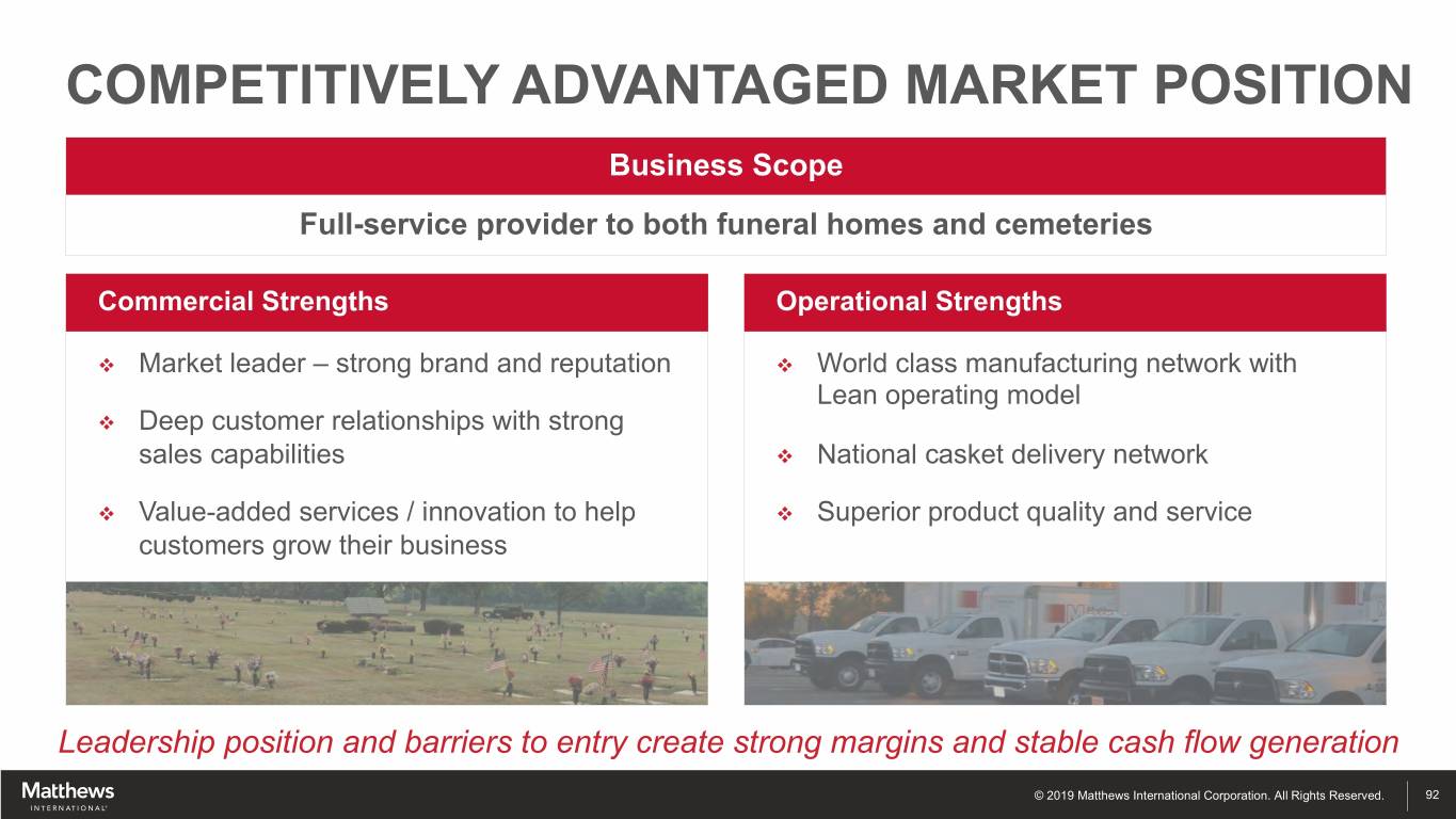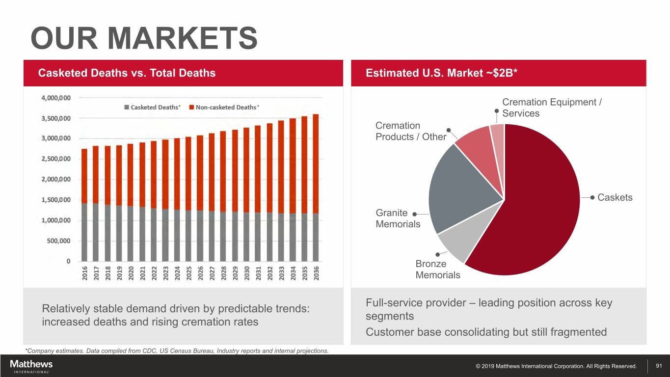 PRODUCTS Cemetery Products Funeral Home Products Cremation Equipment Market Position (U.S.) Bronze Memorials - #1 Caskets - #2 Cremation Equipment - #1 Granite Memorials - #1 Core Geographies North America, Italy, Australia United States Global © 2019 Matthews International Corporation. All Rights Reserved. 90
