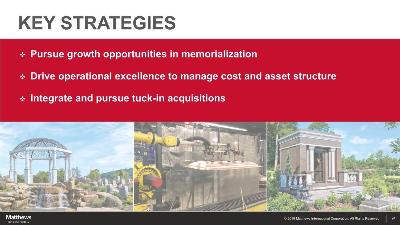 KEY STRATEGIES v Pursue growth opportunities in memorialization v Drive operational excellence to manage cost and asset structure v Integrate and pursue tuck-in acquisitions © 2019 Matthews International Corporation. All Rights Reserved. 94