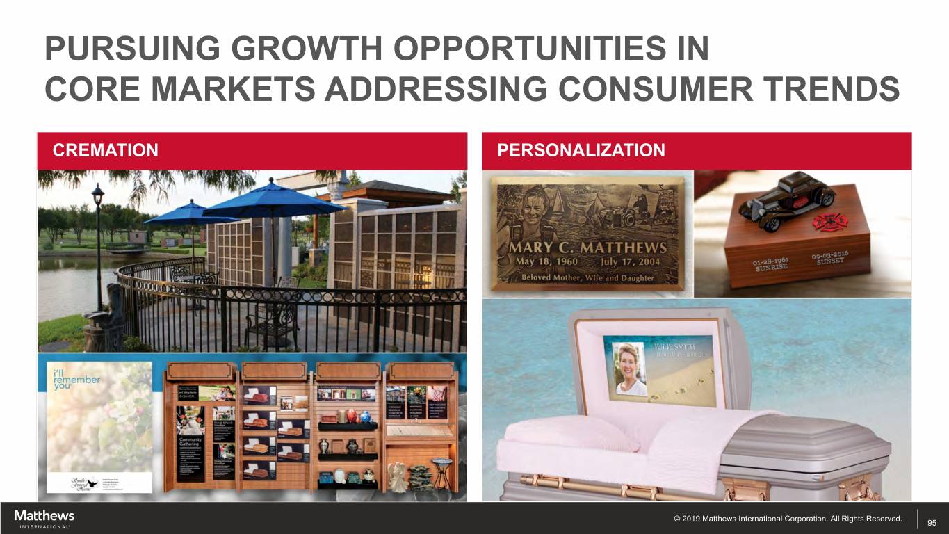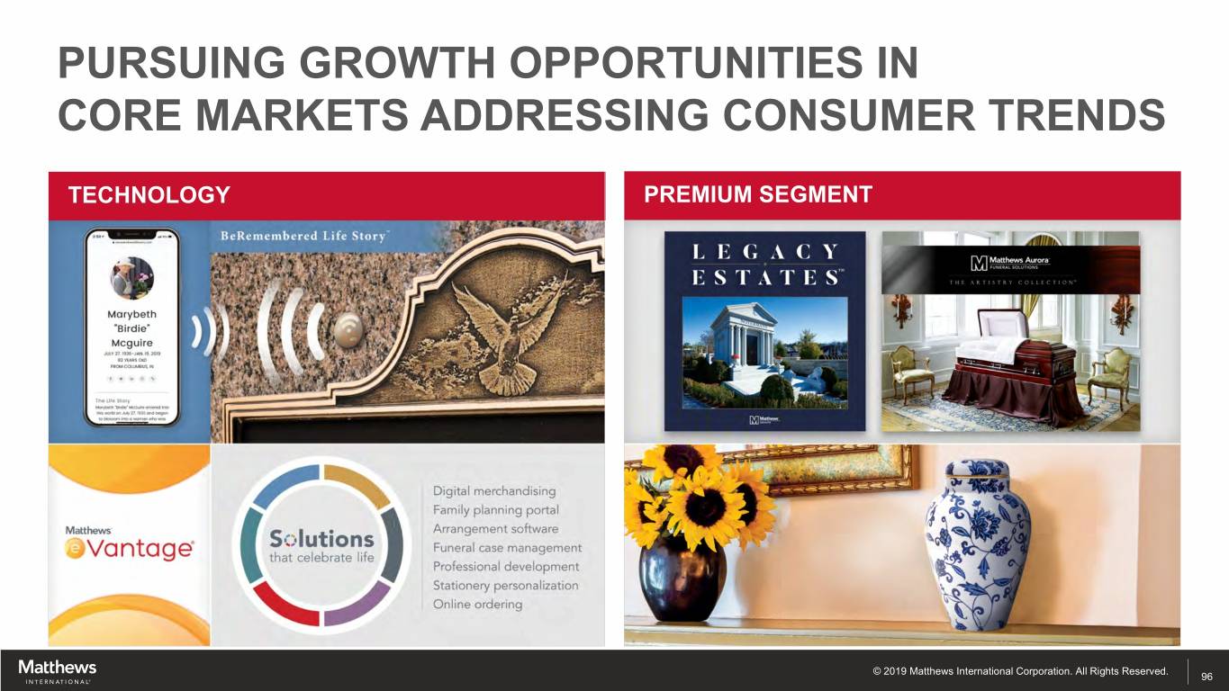 PURSUING GROWTH OPPORTUNITIES IN CORE MARKETS ADDRESSING CONSUMER TRENDS CREMATION PERSONALIZATION © 2019 Matthews International Corporation. All Rights Reserved. 95