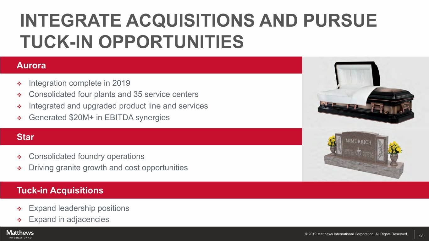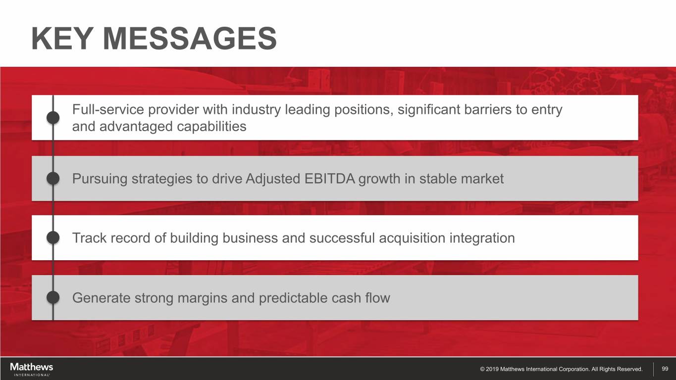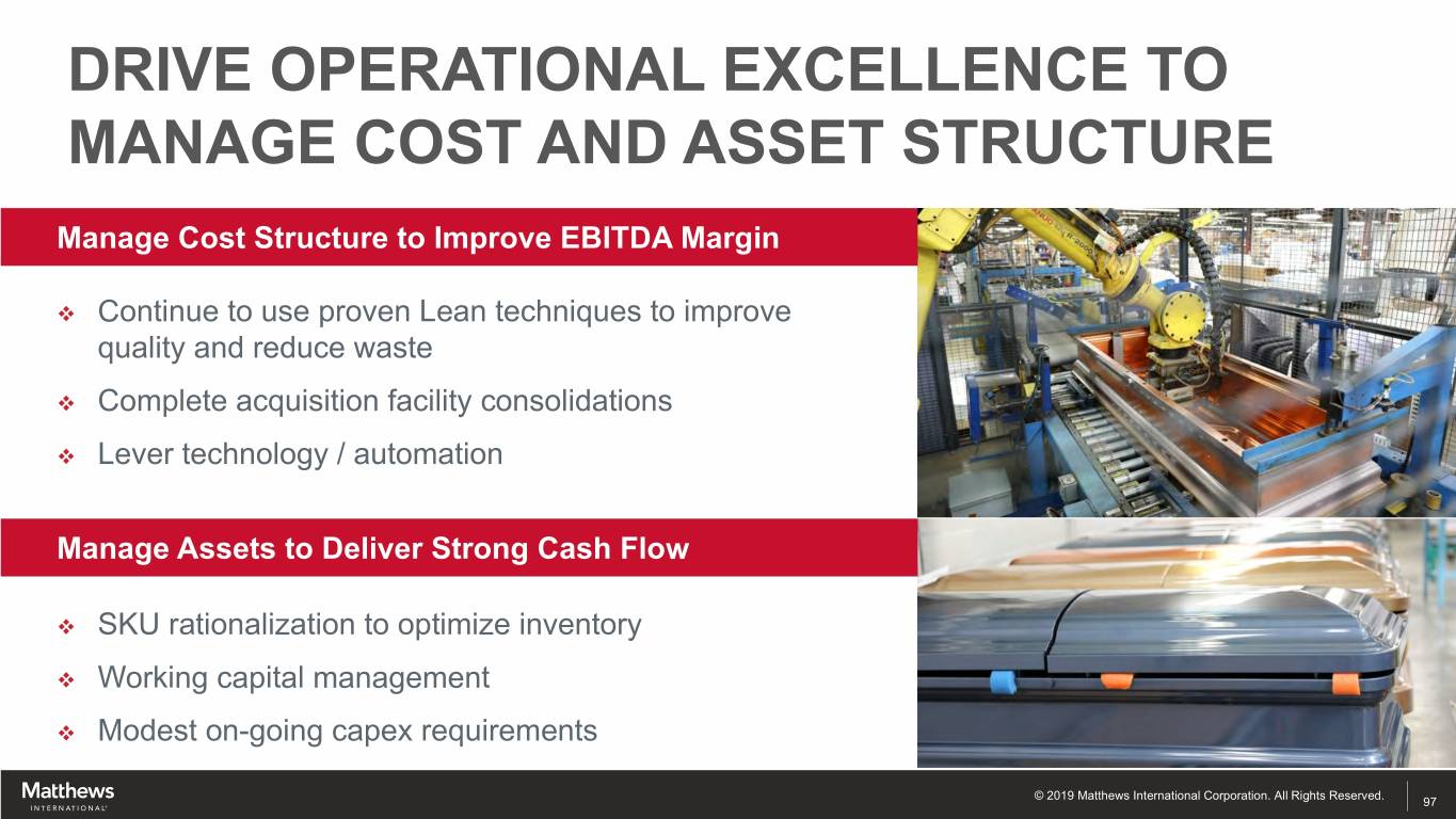 DRIVE OPERATIONAL EXCELLENCE TO MANAGE COST AND ASSET STRUCTURE Manage Cost Structure to Improve EBITDA Margin v Continue to use proven Lean techniques to improve quality and reduce waste v Complete acquisition facility consolidations v Lever technology / automation Manage Assets to Deliver Strong Cash Flow v SKU rationalization to optimize inventory v Working capital management v Modest on-going capex requirements © 2019 Matthews International Corporation. All Rights Reserved. 97