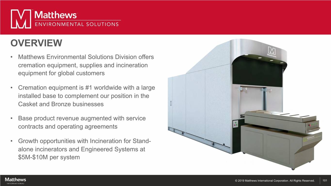 OVERVIEW • Matthews Environmental Solutions Division offers cremation equipment, supplies and incineration equipment for global customers • Cremation equipment is #1 worldwide with a large installed base to complement our position in the Casket and Bronze businesses • Base product revenue augmented with service contracts and operating agreements • Growth opportunities with Incineration for Stand- alone incinerators and Engineered Systems at $5M-$10M per system © 2019 Matthews International Corporation. All Rights Reserved. 101