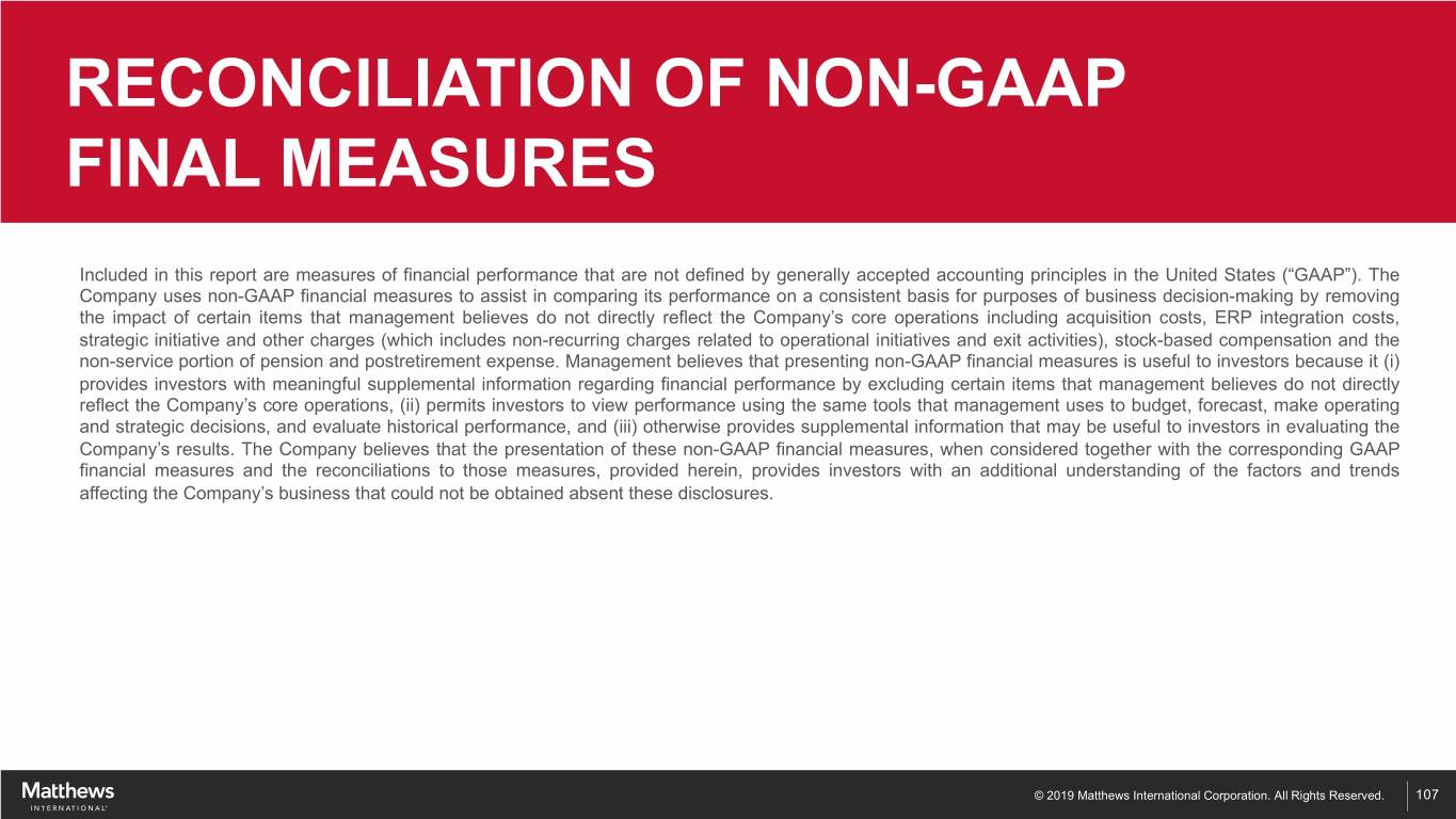 RECONCILIATION OF NON-GAAP FINAL MEASURES Included in this report are measures of financial performance that are not defined by generally accepted accounting principles in the United States (“GAAP”). The Company uses non-GAAP financial measures to assist in comparing its performance on a consistent basis for purposes of business decision-making by removing the impact of certain items that management believes do not directly reflect the Company’s core operations including acquisition costs, ERP integration costs, strategic initiative and other charges (which includes non-recurring charges related to operational initiatives and exit activities), stock-based compensation and the non-service portion of pension and postretirement expense. Management believes that presenting non-GAAP financial measures is useful to investors because it (i) provides investors with meaningful supplemental information regarding financial performance by excluding certain items that management believes do not directly reflect the Company’s core operations, (ii) permits investors to view performance using the same tools that management uses to budget, forecast, make operating and strategic decisions, and evaluate historical performance, and (iii) otherwise provides supplemental information that may be useful to investors in evaluating the Company’s results. The Company believes that the presentation of these non-GAAP financial measures, when considered together with the corresponding GAAP financial measures and the reconciliations to those measures, provided herein, provides investors with an additional understanding of the factors and trends affecting the Company’s business that could not be obtained absent these disclosures. © 2019 Matthews International Corporation. All Rights Reserved. 107