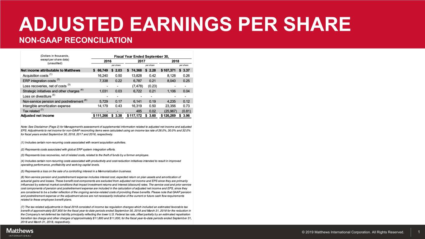 ADJUSTED EARNINGS PER SHARE NON-GAAP RECONCILIATION © 2019 Matthews International Corporation. All Rights Reserved. 1