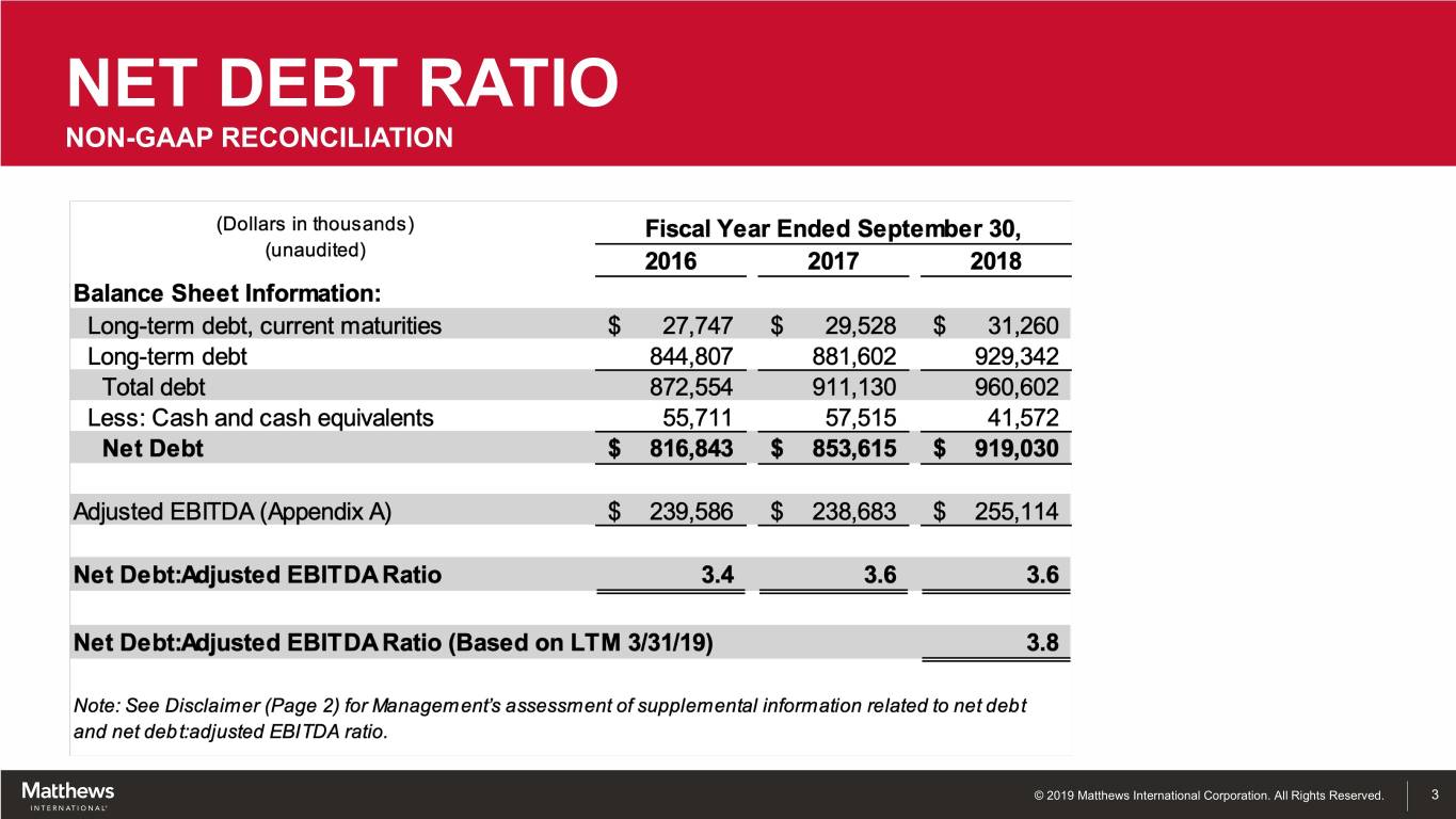 NET DEBT RATIO NON-GAAP RECONCILIATION © 2019 Matthews International Corporation. All Rights Reserved. 3