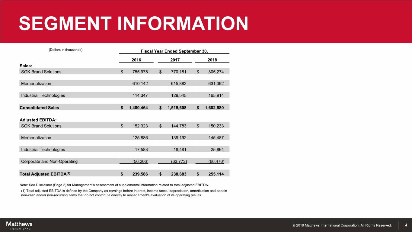 AGENDA & WELCOME 9:00 AM Welcome & Overview Joe Bartolacci, President and Chief Executive Officer Joe Bartolacci, President and Chief Executive Officer 9:05 AM Business & Financial Review Steve Nicola, Chief Financial Officer and Secretary Gary Kohl, President, SGK Brand Solutions 9:30 AM SGK Brand Solutions Greg Babe, Chief Technology Officer 10:15 AM BREAK Brian Dunn, Executive Vice President, Strategy & Corporate Development 10:25 AM Industrial Technologies Paul Jensen, Division President, Industrial Technologies Steven Gackenbach, Group President, Memorialization 11:05 AM Memorialization Brian Dunn, Executive Vice President, Strategy & Corporate Development 11:45 AM Q&A All Leadership 12:00-1:00 PM LUNCH © 2019 Matthews International Corporation. All Rights Reserved. 3