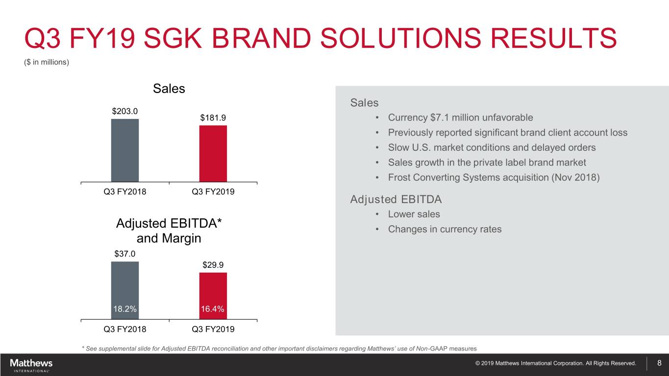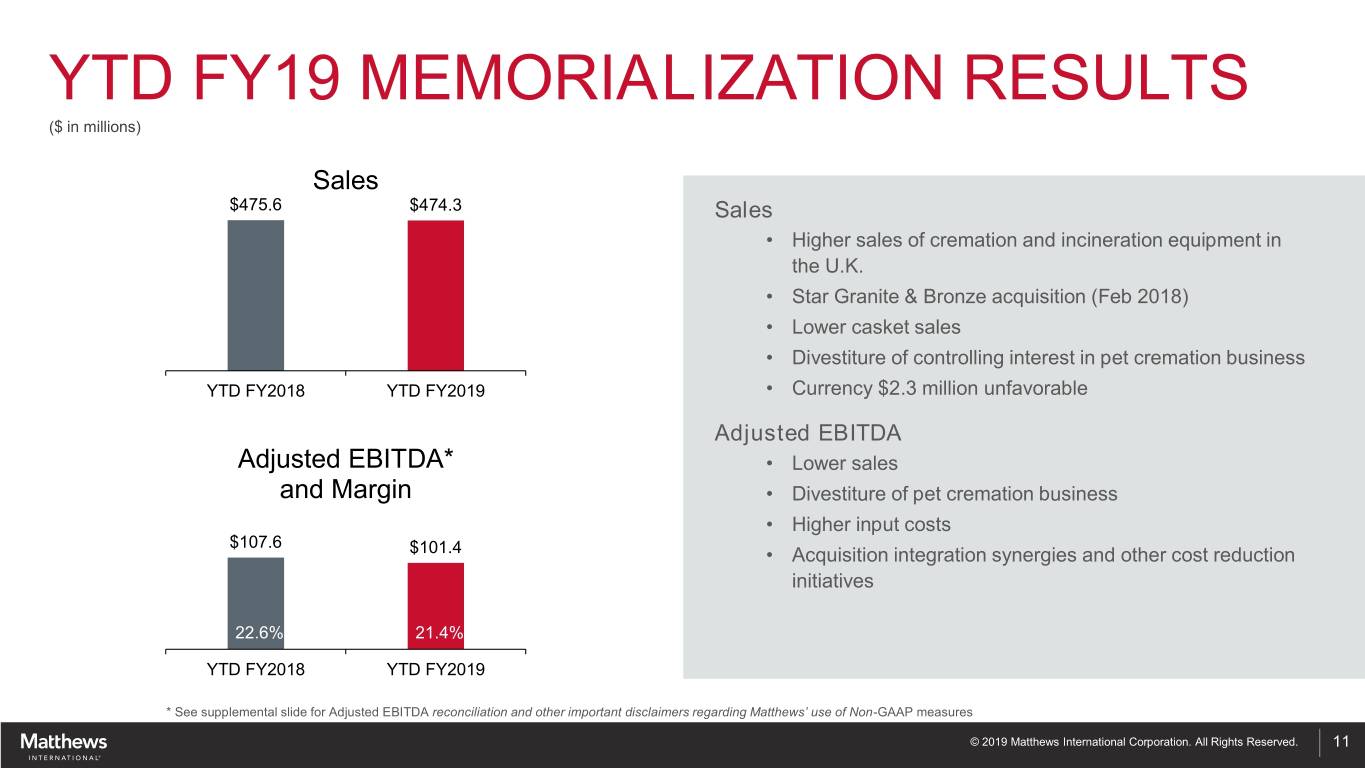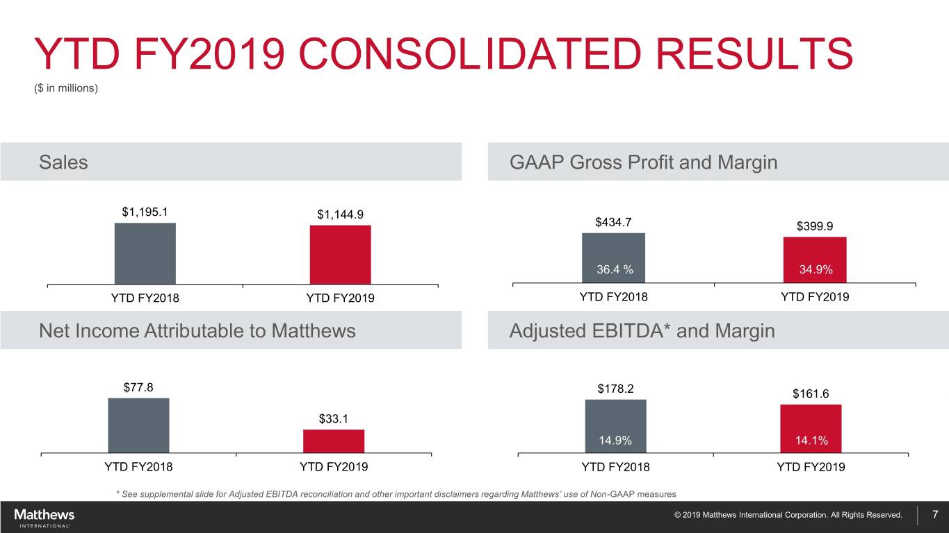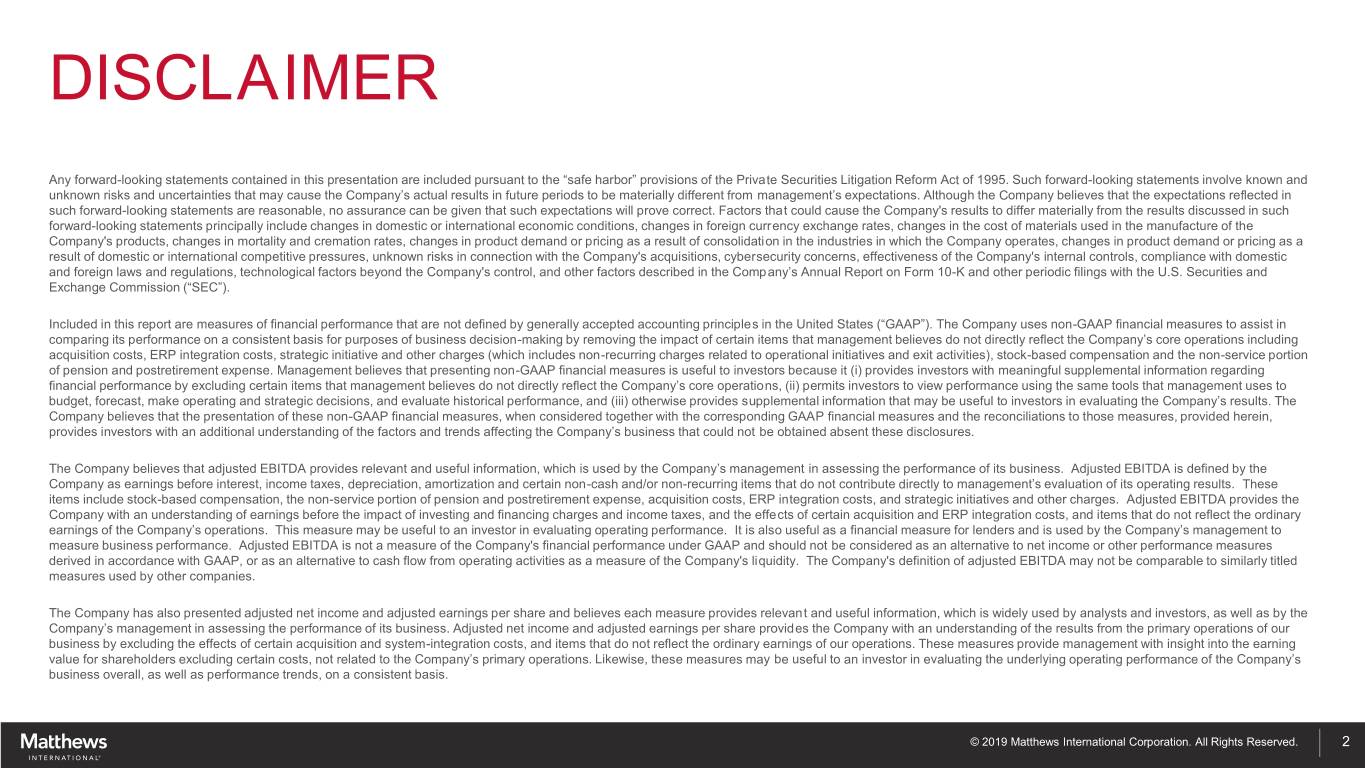 DISCLAIMER Any forward-looking statements contained in this presentation are included pursuant to the “safe harbor” provisions of the Private Securities Litigation Reform Act of 1995. Such forward-looking statements involve known and unknown risks and uncertainties that may cause the Company’s actual results in future periods to be materially different from management’s expectations. Although the Company believes that the expectations reflected in such forward-looking statements are reasonable, no assurance can be given that such expectations will prove correct. Factors that could cause the Company's results to differ materially from the results discussed in such forward-looking statements principally include changes in domestic or international economic conditions, changes in foreign currency exchange rates, changes in the cost of materials used in the manufacture of the Company's products, changes in mortality and cremation rates, changes in product demand or pricing as a result of consolidation in the industries in which the Company operates, changes in product demand or pricing as a result of domestic or international competitive pressures, unknown risks in connection with the Company's acquisitions, cybersecurity concerns, effectiveness of the Company's internal controls, compliance with domestic and foreign laws and regulations, technological factors beyond the Company's control, and other factors described in the Company’s Annual Report on Form 10-K and other periodic filings with the U.S. Securities and Exchange Commission (“SEC”). Included in this report are measures of financial performance that are not defined by generally accepted accounting principles in the United States (“GAAP”). The Company uses non-GAAP financial measures to assist in comparing its performance on a consistent basis for purposes of business decision-making by removing the impact of certain items that management believes do not directly reflect the Company’s core operations including acquisition costs, ERP integration costs, strategic initiative and other charges (which includes non-recurring charges related to operational initiatives and exit activities), stock-based compensation and the non-service portion of pension and postretirement expense. Management believes that presenting non-GAAP financial measures is useful to investors because it (i) provides investors with meaningful supplemental information regarding financial performance by excluding certain items that management believes do not directly reflect the Company’s core operations, (ii) permits investors to view performance using the same tools that management uses to budget, forecast, make operating and strategic decisions, and evaluate historical performance, and (iii) otherwise provides supplemental information that may be useful to investors in evaluating the Company’s results. The Company believes that the presentation of these non-GAAP financial measures, when considered together with the corresponding GAAP financial measures and the reconciliations to those measures, provided herein, provides investors with an additional understanding of the factors and trends affecting the Company’s business that could not be obtained absent these disclosures. The Company believes that adjusted EBITDA provides relevant and useful information, which is used by the Company’s management in assessing the performance of its business. Adjusted EBITDA is defined by the Company as earnings before interest, income taxes, depreciation, amortization and certain non-cash and/or non-recurring items that do not contribute directly to management’s evaluation of its operating results. These items include stock-based compensation, the non-service portion of pension and postretirement expense, acquisition costs, ERP integration costs, and strategic initiatives and other charges. Adjusted EBITDA provides the Company with an understanding of earnings before the impact of investing and financing charges and income taxes, and the effects of certain acquisition and ERP integration costs, and items that do not reflect the ordinary earnings of the Company’s operations. This measure may be useful to an investor in evaluating operating performance. It is also useful as a financial measure for lenders and is used by the Company’s management to measure business performance. Adjusted EBITDA is not a measure of the Company's financial performance under GAAP and should not be considered as an alternative to net income or other performance measures derived in accordance with GAAP, or as an alternative to cash flow from operating activities as a measure of the Company's liquidity. The Company's definition of adjusted EBITDA may not be comparable to similarly titled measures used by other companies. The Company has also presented adjusted net income and adjusted earnings per share and believes each measure provides relevant and useful information, which is widely used by analysts and investors, as well as by the Company’s management in assessing the performance of its business. Adjusted net income and adjusted earnings per share provides the Company with an understanding of the results from the primary operations of our business by excluding the effects of certain acquisition and system-integration costs, and items that do not reflect the ordinary earnings of our operations. These measures provide management with insight into the earning value for shareholders excluding certain costs, not related to the Company’s primary operations. Likewise, these measures may be useful to an investor in evaluating the underlying operating performance of the Company’s business overall, as well as performance trends, on a consistent basis. © 2019 Matthews International Corporation. All Rights Reserved. 2
