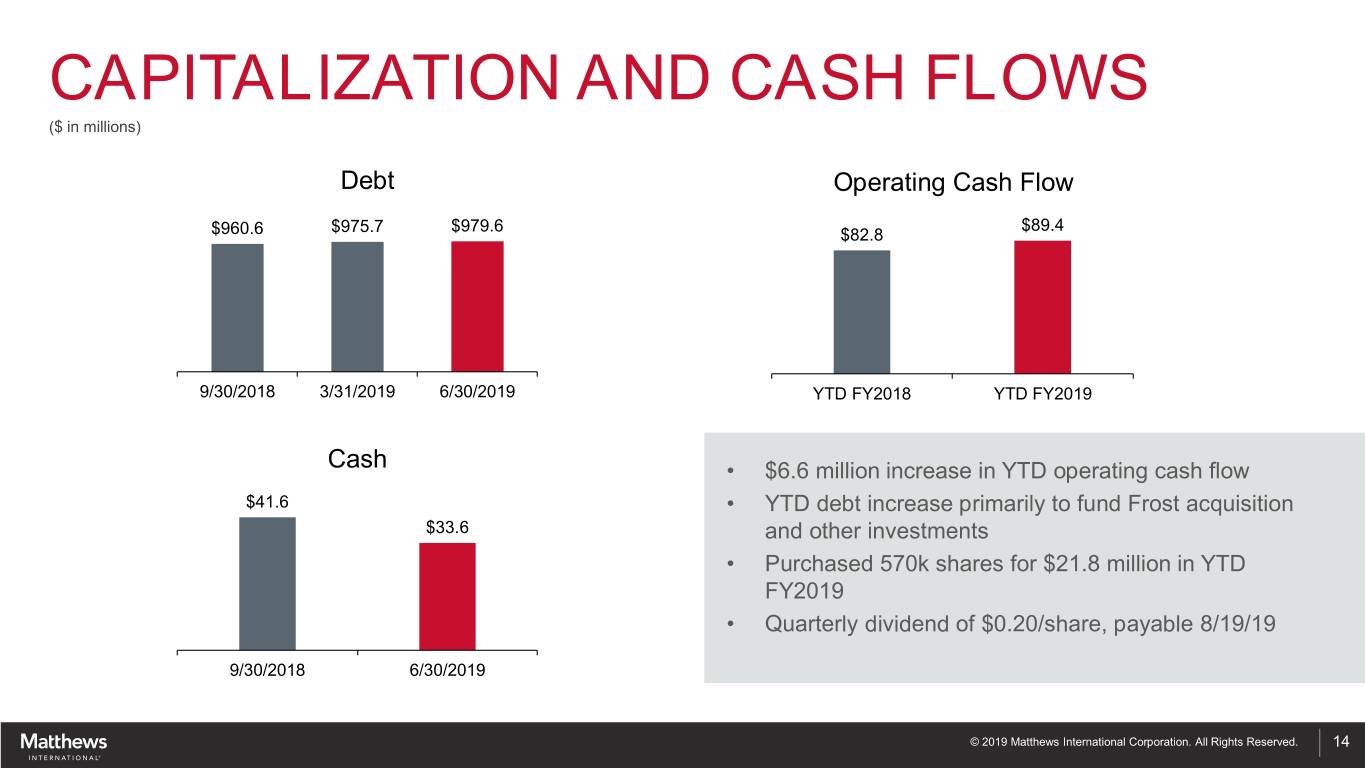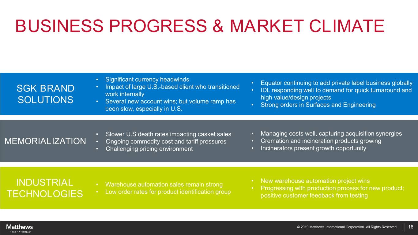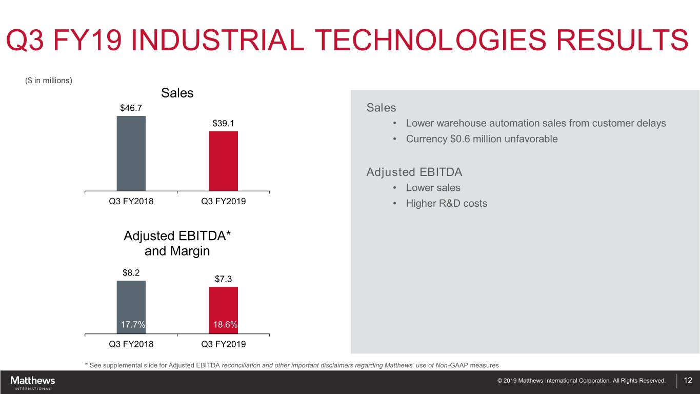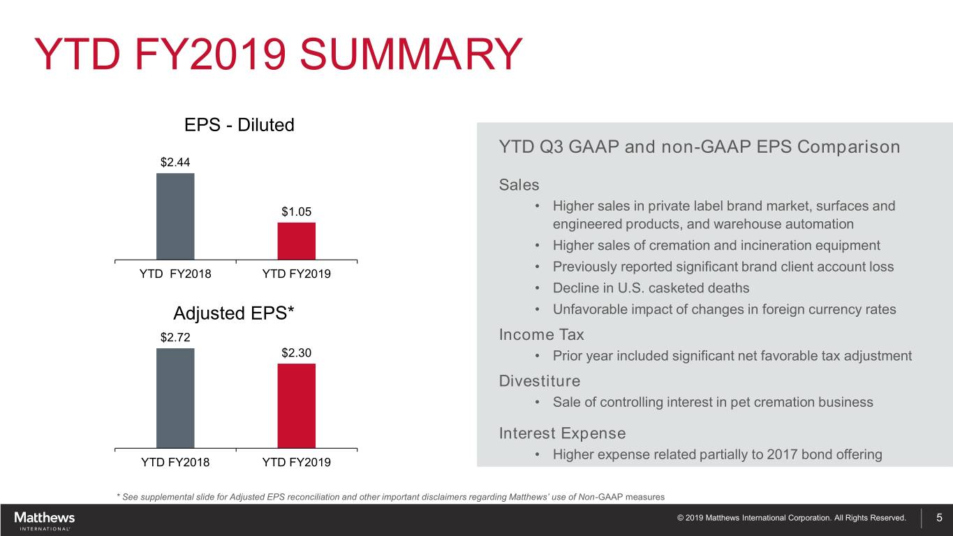 DISCLAIMER Any forward-looking statements contained in this presentation are included pursuant to the “safe harbor” provisions of the Private Securities Litigation Reform Act of 1995. Such forward-looking statements involve known and unknown risks and uncertainties that may cause the Company’s actual results in future periods to be materially different from management’s expectations. Although the Company believes that the expectations reflected in such forward-looking statements are reasonable, no assurance can be given that such expectations will prove correct. Factors that could cause the Company's results to differ materially from the results discussed in such forward-looking statements principally include changes in domestic or international economic conditions, changes in foreign currency exchange rates, changes in the cost of materials used in the manufacture of the Company's products, changes in mortality and cremation rates, changes in product demand or pricing as a result of consolidation in the industries in which the Company operates, changes in product demand or pricing as a result of domestic or international competitive pressures, unknown risks in connection with the Company's acquisitions, cybersecurity concerns, effectiveness of the Company's internal controls, compliance with domestic and foreign laws and regulations, technological factors beyond the Company's control, and other factors described in the Company’s Annual Report on Form 10-K and other periodic filings with the U.S. Securities and Exchange Commission (“SEC”). Included in this report are measures of financial performance that are not defined by generally accepted accounting principles in the United States (“GAAP”). The Company uses non-GAAP financial measures to assist in comparing its performance on a consistent basis for purposes of business decision-making by removing the impact of certain items that management believes do not directly reflect the Company’s core operations including acquisition costs, ERP integration costs, strategic initiative and other charges (which includes non-recurring charges related to operational initiatives and exit activities), stock-based compensation and the non-service portion of pension and postretirement expense. Management believes that presenting non-GAAP financial measures is useful to investors because it (i) provides investors with meaningful supplemental information regarding financial performance by excluding certain items that management believes do not directly reflect the Company’s core operations, (ii) permits investors to view performance using the same tools that management uses to budget, forecast, make operating and strategic decisions, and evaluate historical performance, and (iii) otherwise provides supplemental information that may be useful to investors in evaluating the Company’s results. The Company believes that the presentation of these non-GAAP financial measures, when considered together with the corresponding GAAP financial measures and the reconciliations to those measures, provided herein, provides investors with an additional understanding of the factors and trends affecting the Company’s business that could not be obtained absent these disclosures. The Company believes that adjusted EBITDA provides relevant and useful information, which is used by the Company’s management in assessing the performance of its business. Adjusted EBITDA is defined by the Company as earnings before interest, income taxes, depreciation, amortization and certain non-cash and/or non-recurring items that do not contribute directly to management’s evaluation of its operating results. These items include stock-based compensation, the non-service portion of pension and postretirement expense, acquisition costs, ERP integration costs, and strategic initiatives and other charges. Adjusted EBITDA provides the Company with an understanding of earnings before the impact of investing and financing charges and income taxes, and the effects of certain acquisition and ERP integration costs, and items that do not reflect the ordinary earnings of the Company’s operations. This measure may be useful to an investor in evaluating operating performance. It is also useful as a financial measure for lenders and is used by the Company’s management to measure business performance. Adjusted EBITDA is not a measure of the Company's financial performance under GAAP and should not be considered as an alternative to net income or other performance measures derived in accordance with GAAP, or as an alternative to cash flow from operating activities as a measure of the Company's liquidity. The Company's definition of adjusted EBITDA may not be comparable to similarly titled measures used by other companies. The Company has also presented adjusted net income and adjusted earnings per share and believes each measure provides relevant and useful information, which is widely used by analysts and investors, as well as by the Company’s management in assessing the performance of its business. Adjusted net income and adjusted earnings per share provides the Company with an understanding of the results from the primary operations of our business by excluding the effects of certain acquisition and system-integration costs, and items that do not reflect the ordinary earnings of our operations. These measures provide management with insight into the earning value for shareholders excluding certain costs, not related to the Company’s primary operations. Likewise, these measures may be useful to an investor in evaluating the underlying operating performance of the Company’s business overall, as well as performance trends, on a consistent basis. © 2019 Matthews International Corporation. All Rights Reserved. 2