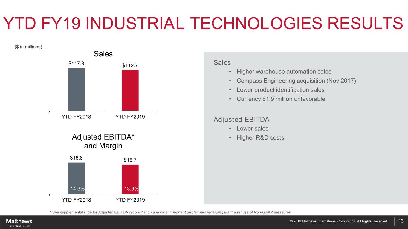 Q3 FY19 INDUSTRIAL TECHNOLOGIES RESULTS ($ in millions) Sales $46.7 Sales $39.1 • Lower warehouse automation sales from customer delays • Currency $0.6 million unfavorable Adjusted EBITDA • Lower sales Q3 FY2018 Q3 FY2019 • Higher R&D costs Adjusted EBITDA* and Margin $8.2 $7.3 17.7% 18.6% Q3 FY2018 Q3 FY2019 * See supplemental slide for Adjusted EBITDA reconciliation and other important disclaimers regarding Matthews’ use of Non-GAAP measures © 2019 Matthews International Corporation. All Rights Reserved. 12
