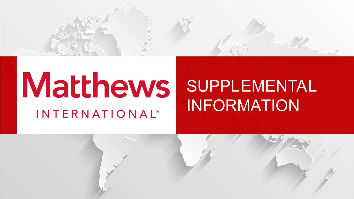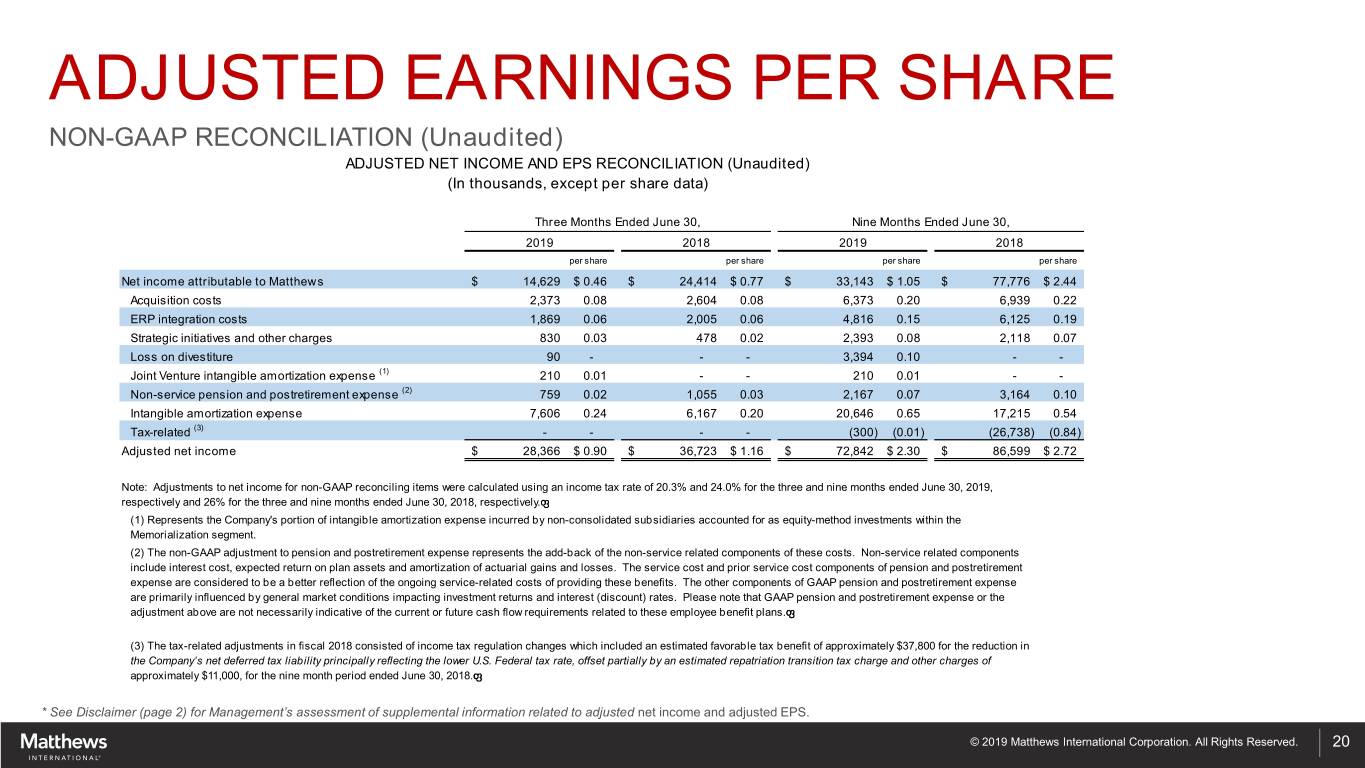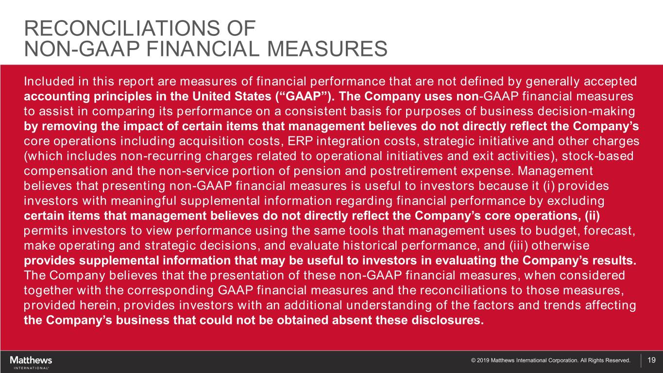 RECONCILIATIONS OF NON-GAAP FINANCIAL MEASURES Included in this report are measures of financial performance that are not defined by generally accepted accounting principles in the United States (“GAAP”). The Company uses non-GAAP financial measures to assist in comparing its performance on a consistent basis for purposes of business decision-making by removing the impact of certain items that management believes do not directly reflect the Company’s core operations including acquisition costs, ERP integration costs, strategic initiative and other charges (which includes non-recurring charges related to operational initiatives and exit activities), stock-based compensation and the non-service portion of pension and postretirement expense. Management believes that presenting non-GAAP financial measures is useful to investors because it (i) provides investors with meaningful supplemental information regarding financial performance by excluding certain items that management believes do not directly reflect the Company’s core operations, (ii) permits investors to view performance using the same tools that management uses to budget, forecast, make operating and strategic decisions, and evaluate historical performance, and (iii) otherwise provides supplemental information that may be useful to investors in evaluating the Company’s results. The Company believes that the presentation of these non-GAAP financial measures, when considered together with the corresponding GAAP financial measures and the reconciliations to those measures, provided herein, provides investors with an additional understanding of the factors and trends affecting the Company’s business that could not be obtained absent these disclosures. © 2019 Matthews International Corporation. All Rights Reserved. 19