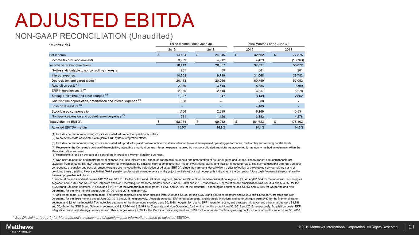 ADJUSTED EARNINGS PER SHARE NON-GAAP RECONCILIATION (Unaudited) ADJUSTED NET INCOME AND EPS RECONCILIATION (Unaudited) (In thousands, except per share data) Three Months Ended June 30, Nine Months Ended June 30, 2019 2018 2019 2018 per share per share per share per share Net income attributable to Matthews $ 14,629 $ 0.46 $ 24,414 $ 0.77 $ 33,143 $ 1.05 $ 77,776 $ 2.44 Acquisition costs 2,373 0.08 2,604 0.08 6,373 0.20 6,939 0.22 ERP integration costs 1,869 0.06 2,005 0.06 4,816 0.15 6,125 0.19 Strategic initiatives and other charges 830 0.03 478 0.02 2,393 0.08 2,118 0.07 Loss on divestiture 90 - - - 3,394 0.10 - - Joint Venture intangible amortization expense (1) 210 0.01 - - 210 0.01 - - Non-service pension and postretirement expense (2) 759 0.02 1,055 0.03 2,167 0.07 3,164 0.10 Intangible amortization expense 7,606 0.24 6,167 0.20 20,646 0.65 17,215 0.54 Tax-related (3) - - - - (300) (0.01) (26,738) (0.84) Adjusted net income $ 28,366 $ 0.90 $ 36,723 $ 1.16 $ 72,842 $ 2.30 $ 86,599 $ 2.72 Note: Adjustments to net income for non-GAAP reconciling items were calculated using an income tax rate of 20.3% and 24.0% for the three and nine months ended June 30, 2019, respectively and 26% for the three and nine months ended June 30, 2018, respectively. (1) Represents the Company's portion of intangible amortization expense incurred by non-consolidated subsidiaries accounted for as equity-method investments within the Memorialization segment. (2) The non-GAAP adjustment to pension and postretirement expense represents the add-back of the non-service related components of these costs. Non-service related components include interest cost, expected return on plan assets and amortization of actuarial gains and losses. The service cost and prior service cost components of pension and postretirement expense are considered to be a better reflection of the ongoing service-related costs of providing these benefits. The other components of GAAP pension and postretirement expense are primarily influenced by general market conditions impacting investment returns and interest (discount) rates. Please note that GAAP pension and postretirement expense or the adjustment above are not necessarily indicative of the current or future cash flow requirements related to these employee benefit plans. (3) The tax-related adjustments in fiscal 2018 consisted of income tax regulation changes which included an estimated favorable tax benefit of approximately $37,800 for the reduction in the Company’s net deferred tax liability principally reflecting the lower U.S. Federal tax rate, offset partially by an estimated repatriation transition tax charge and other charges of approximately $11,000, for the nine month period ended June 30, 2018. * See Disclaimer (page 2) for Management’s assessment of supplemental information related to adjusted net income and adjusted EPS. © 2019 Matthews International Corporation. All Rights Reserved. 20
