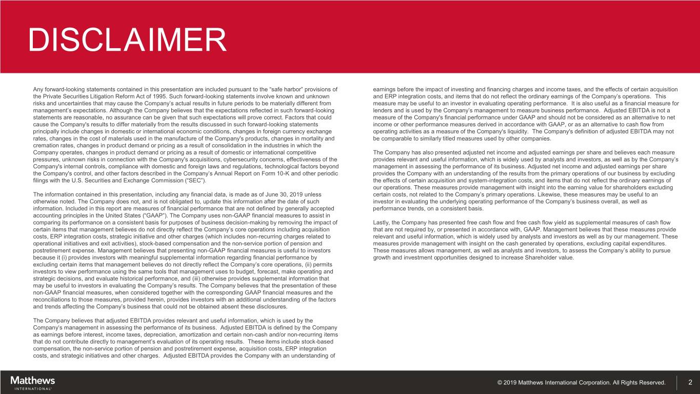 DISCLAIMER Any forward-looking statements contained in this presentation are included pursuant to the “safe harbor” provisions of earnings before the impact of investing and financing charges and income taxes, and the effects of certain acquisition the Private Securities Litigation Reform Act of 1995. Such forward-looking statements involve known and unknown and ERP integration costs, and items that do not reflect the ordinary earnings of the Company’s operations. This risks and uncertainties that may cause the Company’s actual results in future periods to be materially different from measure may be useful to an investor in evaluating operating performance. It is also useful as a financial measure for management’s expectations. Although the Company believes that the expectations reflected in such forward-looking lenders and is used by the Company’s management to measure business performance. Adjusted EBITDA is not a statements are reasonable, no assurance can be given that such expectations will prove correct. Factors that could measure of the Company's financial performance under GAAP and should not be considered as an alternative to net cause the Company's results to differ materially from the results discussed in such forward-looking statements income or other performance measures derived in accordance with GAAP, or as an alternative to cash flow from principally include changes in domestic or international economic conditions, changes in foreign currency exchange operating activities as a measure of the Company's liquidity. The Company's definition of adjusted EBITDA may not rates, changes in the cost of materials used in the manufacture of the Company's products, changes in mortality and be comparable to similarly titled measures used by other companies. cremation rates, changes in product demand or pricing as a result of consolidation in the industries in which the Company operates, changes in product demand or pricing as a result of domestic or international competitive The Company has also presented adjusted net income and adjusted earnings per share and believes each measure pressures, unknown risks in connection with the Company's acquisitions, cybersecurity concerns, effectiveness of the provides relevant and useful information, which is widely used by analysts and investors, as well as by the Company’s Company's internal controls, compliance with domestic and foreign laws and regulations, technological factors beyond management in assessing the performance of its business. Adjusted net income and adjusted earnings per share the Company's control, and other factors described in the Company’s Annual Report on Form 10-K and other periodic provides the Company with an understanding of the results from the primary operations of our business by excluding filings with the U.S. Securities and Exchange Commission (“SEC”). the effects of certain acquisition and system-integration costs, and items that do not reflect the ordinary earnings of our operations. These measures provide management with insight into the earning value for shareholders excluding The information contained in this presentation, including any financial data, is made as of June 30, 2019 unless certain costs, not related to the Company’s primary operations. Likewise, these measures may be useful to an otherwise noted. The Company does not, and is not obligated to, update this information after the date of such investor in evaluating the underlying operating performance of the Company’s business overall, as well as information. Included in this report are measures of financial performance that are not defined by generally accepted performance trends, on a consistent basis. accounting principles in the United States (“GAAP”). The Company uses non-GAAP financial measures to assist in comparing its performance on a consistent basis for purposes of business decision-making by removing the impact of Lastly, the Company has presented free cash flow and free cash flow yield as supplemental measures of cash flow certain items that management believes do not directly reflect the Company’s core operations including acquisition that are not required by, or presented in accordance with, GAAP. Management believes that these measures provide costs, ERP integration costs, strategic initiative and other charges (which includes non-recurring charges related to relevant and useful information, which is widely used by analysts and investors as well as by our management. These operational initiatives and exit activities), stock-based compensation and the non-service portion of pension and measures provide management with insight on the cash generated by operations, excluding capital expenditures. postretirement expense. Management believes that presenting non-GAAP financial measures is useful to investors These measures allows management, as well as analysts and investors, to assess the Company’s ability to pursue because it (i) provides investors with meaningful supplemental information regarding financial performance by growth and investment opportunities designed to increase Shareholder value. excluding certain items that management believes do not directly reflect the Company’s core operations, (ii) permits investors to view performance using the same tools that management uses to budget, forecast, make operating and strategic decisions, and evaluate historical performance, and (iii) otherwise provides supplemental information that may be useful to investors in evaluating the Company’s results. The Company believes that the presentation of these non-GAAP financial measures, when considered together with the corresponding GAAP financial measures and the reconciliations to those measures, provided herein, provides investors with an additional understanding of the factors and trends affecting the Company’s business that could not be obtained absent these disclosures. The Company believes that adjuste