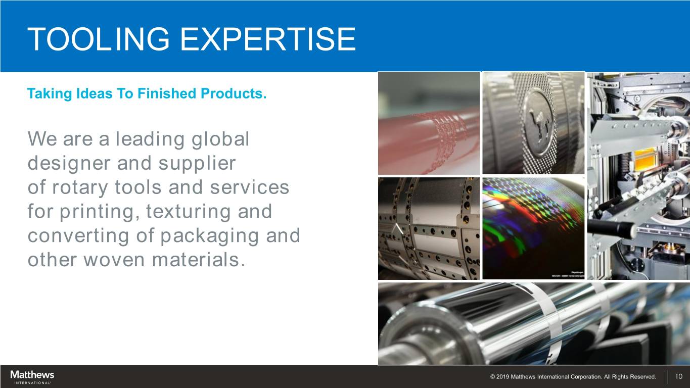 TOOLING EXPERTISE Taking Ideas To Finished Products. We are a leading global designer and supplier of rotary tools and services for printing, texturing and converting of packaging and other woven materials. © 2019 Matthews International Corporation. All Rights Reserved. 10