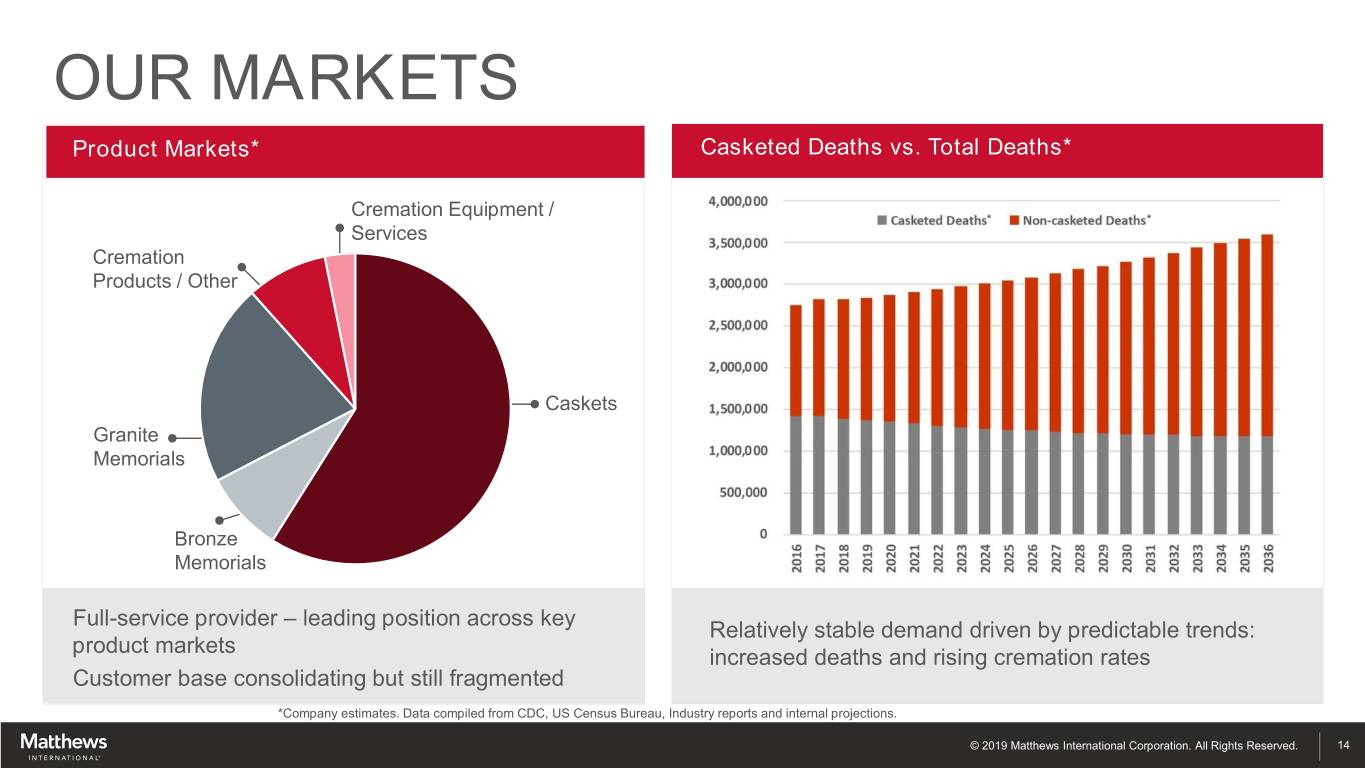 PRODUCTS Cemetery Products Funeral Home Products Cremation Equipment Market Position (U.S.) Bronze Memorials - #1 Caskets - #2 Cremation Equipment - #1 Granite Memorials - #1 Core Geographies North America, Italy, Australia United States Global © 2019 Matthews International Corporation. All Rights Reserved. 13
