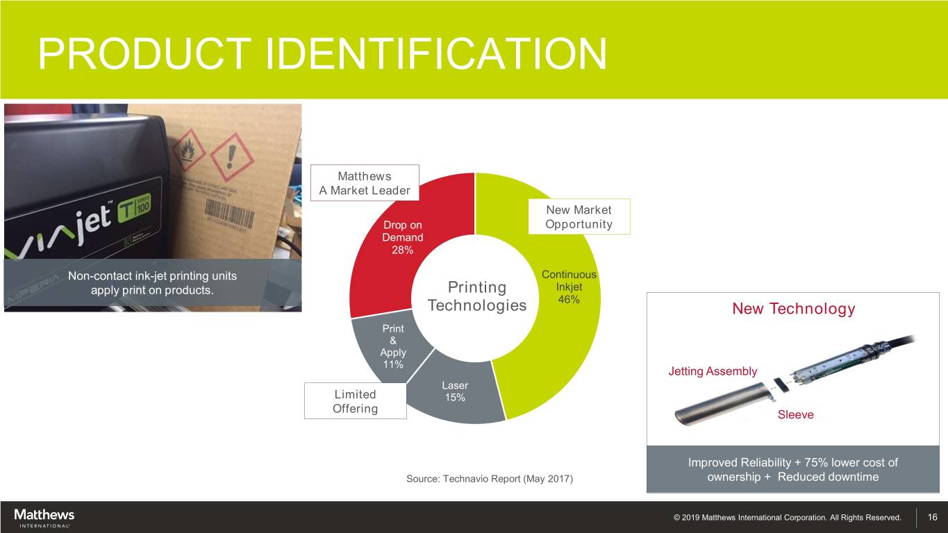 PRODUCT IDENTIFICATION Matthews A Market Leader New Market Drop on Opportunity Demand 28% Non-contact ink-jet printing units Continuous apply print on products. Printing Inkjet 46% Technologies New Technology Print & Apply 11% Jetting Assembly Laser Limited 15% Offering Sleeve Improved Reliability + 75% lower cost of Source: Technavio Report (May 2017) ownership + Reduced downtime © 2019 Matthews International Corporation. All Rights Reserved. 16