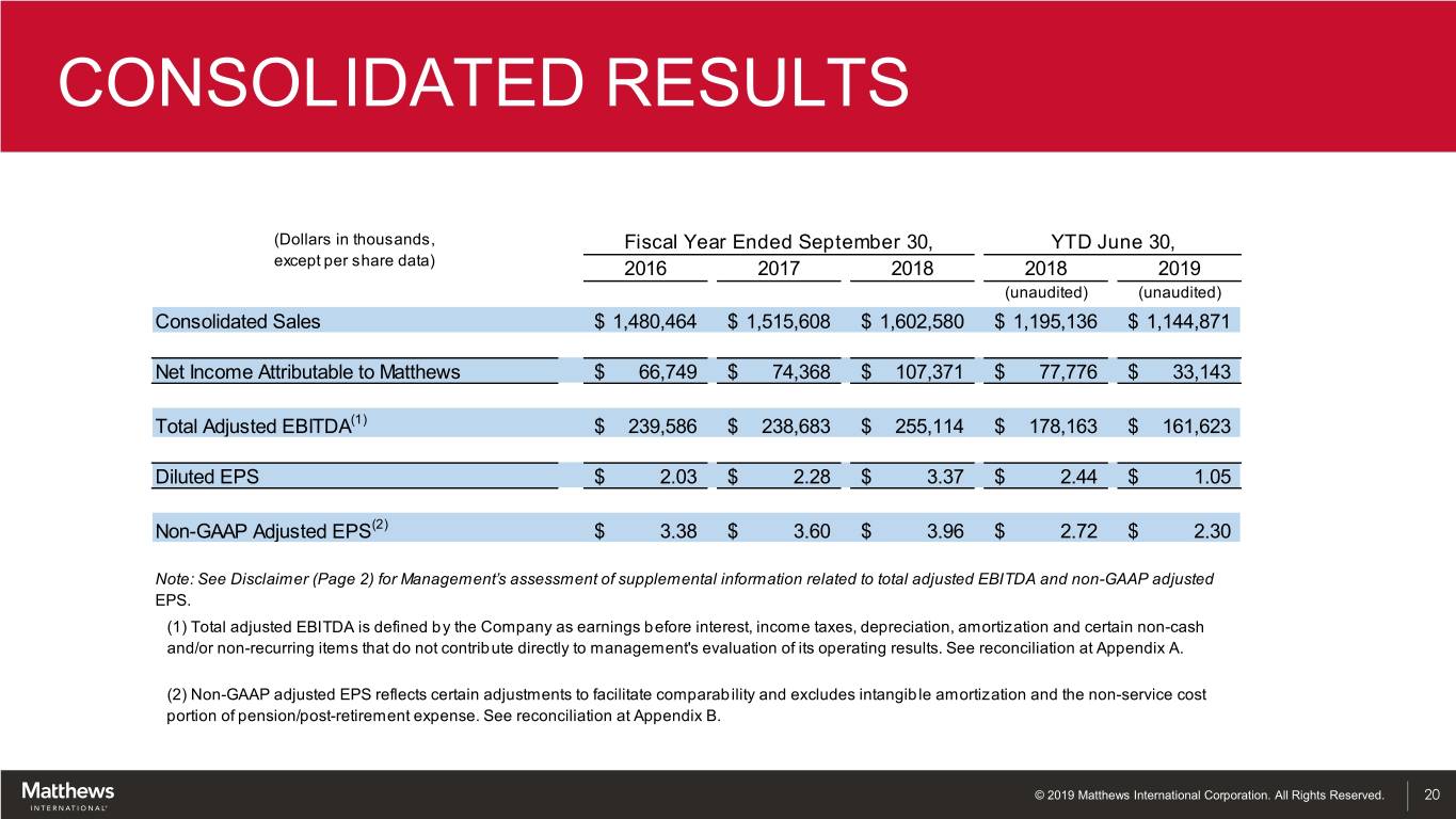 CONSOLIDATED RESULTS (Dollars in thousands, Fiscal Year Ended September 30, YTD June 30, except per share data) 2016 2017 2018 2018 2019 (unaudited) (unaudited) Consolidated Sales $ 1,480,464 $ 1,515,608 $ 1,602,580 $ 1,195,136 $ 1,144,871 Net Income Attributable to Matthews $ 66,749 $ 74,368 $ 107,371 $ 77,776 $ 33,143 Total Adjusted EBITDA(1) $ 239,586 $ 238,683 $ 255,114 $ 178,163 $ 161,623 Diluted EPS $ 2.03 $ 2.28 $ 3.37 $ 2.44 $ 1.05 Non-GAAP Adjusted EPS(2) $ 3.38 $ 3.60 $ 3.96 $ 2.72 $ 2.30 Note: See Disclaimer (Page 2) for Management’s assessment of supplemental information related to total adjusted EBITDA and non-GAAP adjusted EPS. (1) Total adjusted EBITDA is defined by the Company as earnings before interest, income taxes, depreciation, amortization and certain non-cash and/or non-recurring items that do not contribute directly to management's evaluation of its operating results. See reconciliation at Appendix A. (2) Non-GAAP adjusted EPS reflects certain adjustments to facilitate comparability and excludes intangible amortization and the non-service cost portion of pension/post-retirement expense. See reconciliation at Appendix B. © 2019 Matthews International Corporation. All Rights Reserved. 20