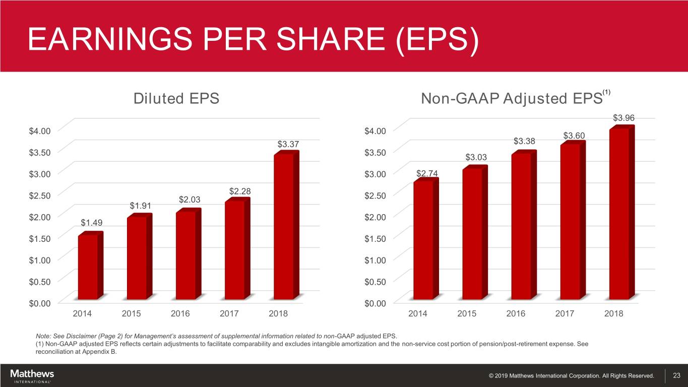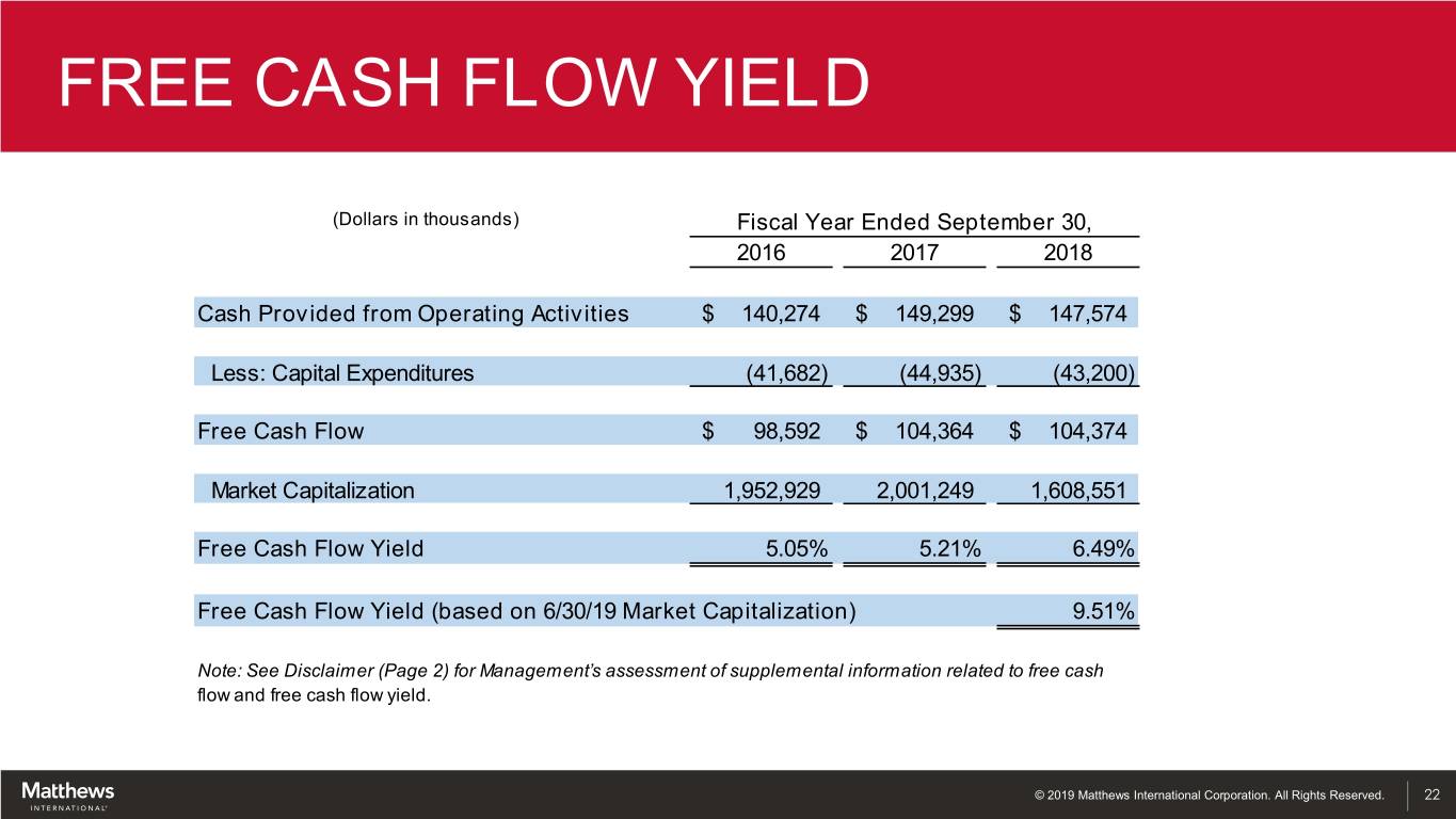 FREE CASH FLOW YIELD (Dollars in thousands) Fiscal Year Ended September 30, 2016 2017 2018 Cash Provided from Operating Activities $ 140,274 $ 149,299 $ 147,574 Less: Capital Expenditures (41,682) (44,935) (43,200) Free Cash Flow $ 98,592 $ 104,364 $ 104,374 Market Capitalization 1,952,929 2,001,249 1,608,551 Free Cash Flow Yield 5.05% 5.21% 6.49% Free Cash Flow Yield (based on 6/30/19 Market Capitalization) 9.51% Note: See Disclaimer (Page 2) for Management’s assessment of supplemental information related to free cash flow and free cash flow yield. © 2019 Matthews International Corporation. All Rights Reserved. 22