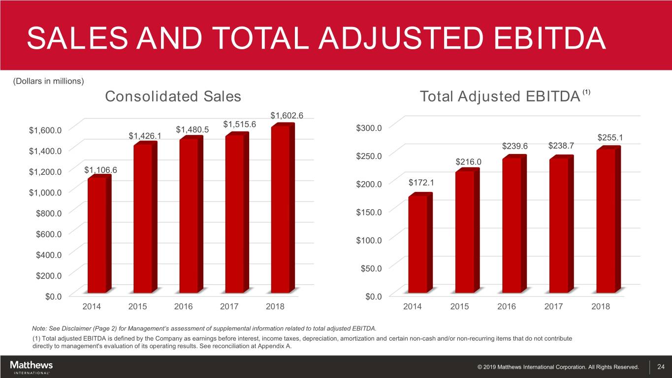 EARNINGS PER SHARE (EPS) Diluted EPS Non-GAAP Adjusted EPS(1) $3.96 $4.00 $4.00 $3.60 $3.37 $3.38 $3.50 $3.50 $3.03 $3.00 $3.00 $2.74 $2.28 $2.50 $2.03 $2.50 $1.91 $2.00 $2.00 $1.49 $1.50 $1.50 $1.00 $1.00 $0.50 $0.50 $0.00 $0.00 2014 2015 2016 2017 2018 2014 2015 2016 2017 2018 Note: See Disclaimer (Page 2) for Management’s assessment of supplemental information related to non-GAAP adjusted EPS. (1) Non-GAAP adjusted EPS reflects certain adjustments to facilitate comparability and excludes intangible amortization and the non-service cost portion of pension/post-retirement expense. See reconciliation at Appendix B. © 2019 Matthews International Corporation. All Rights Reserved. 23