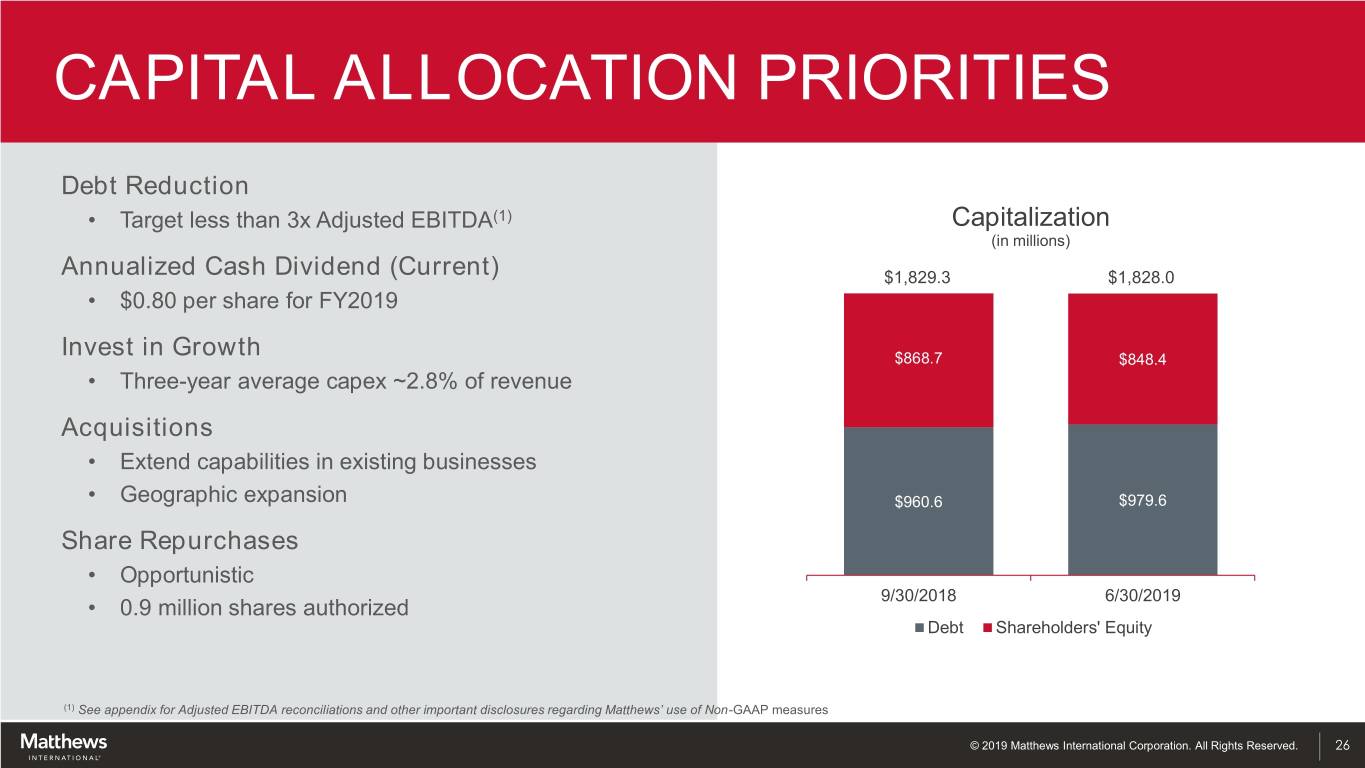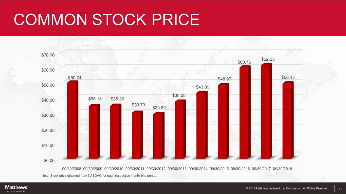 COMMON STOCK PRICE $70.00 $62.25 $60.76 $60.00 $50.74 $48.97 $50.15 $50.00 $43.89 $38.08 $40.00 $35.18 $35.36 $30.73 $29.82 $30.00 $20.00 $10.00 $0.00 09/30/2008 09/30/2009 09/30/2010 09/30/2011 09/30/2012 09/30/2013 09/30/2014 09/30/2015 09/30/2016 09/30/2017 09/30/2018 Note: Stock price obtained from NASDAQ for each respective month-end period. © 2019 Matthews International Corporation. All Rights Reserved. 25