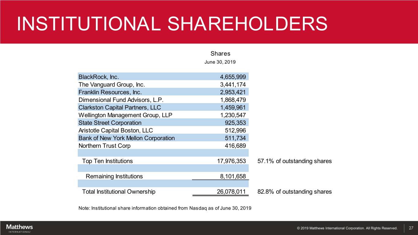 INSTITUTIONAL SHAREHOLDERS Shares June 30, 2019 BlackRock, Inc. 4,655,999 The Vanguard Group, Inc. 3,441,174 Franklin Resources, Inc. 2,953,421 Dimensional Fund Advisors, L.P. 1,868,479 Clarkston Capital Partners, LLC 1,459,961 Wellington Management Group, LLP 1,230,547 State Street Corporation 925,353 Aristotle Capital Boston, LLC 512,996 Bank of New York Mellon Corporation 511,734 Northern Trust Corp 416,689 Top Ten Institutions 17,976,353 57.1% of outstanding shares Remaining Institutions 8,101,658 Total Institutional Ownership 26,078,011 82.8% of outstanding shares Note: Institutional share information obtained from Nasdaq as of June 30, 2019 © 2019 Matthews International Corporation. All Rights Reserved. 27