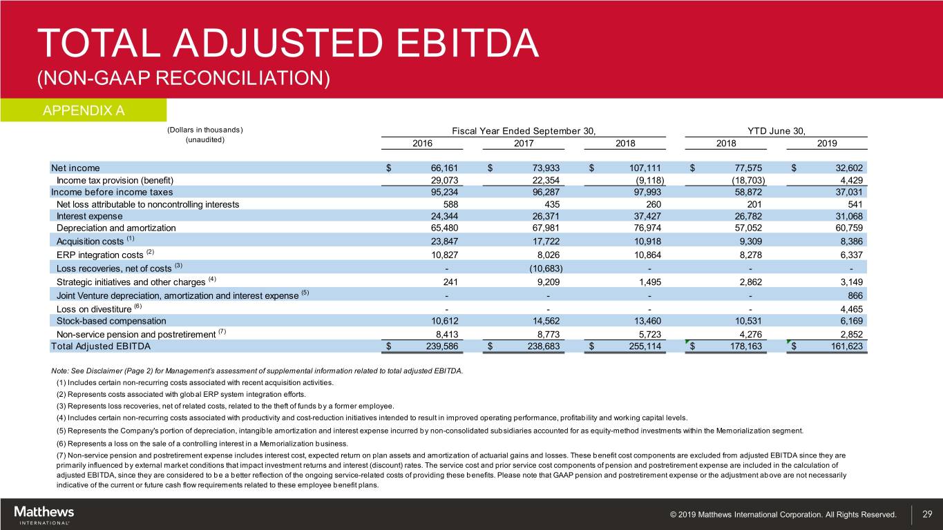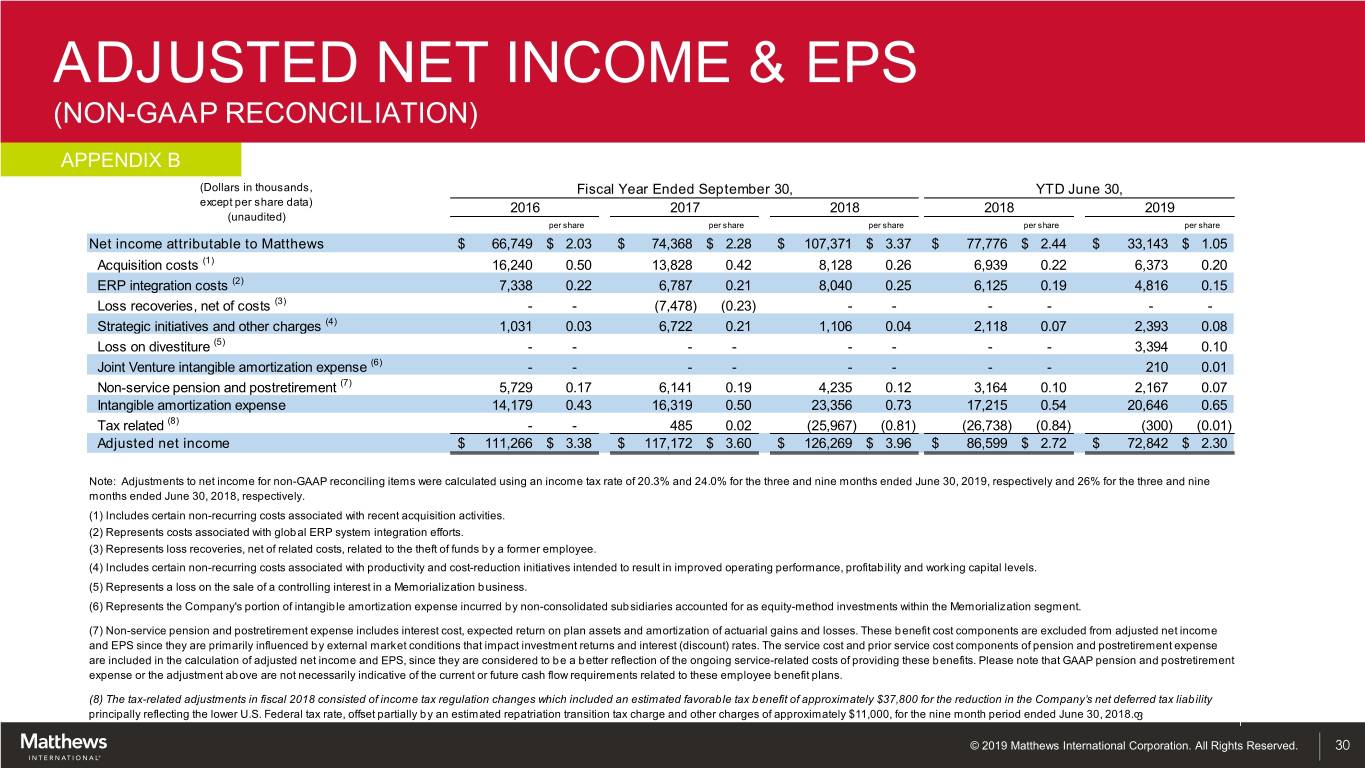 TOTAL ADJUSTED EBITDA (NON-GAAP RECONCILIATION) APPENDIX A (Dollars in thousands) Fiscal Year Ended September 30, YTD June 30, (unaudited) 2016 2017 2018 2018 2019 Net income $ 66,161 $ 73,933 $ 107,111 $ 77,575 $ 32,602 Income tax provision (benefit) 29,073 22,354 (9,118) (18,703) 4,429 Income before income taxes 95,234 96,287 97,993 58,872 37,031 Net loss attributable to noncontrolling interests 588 435 260 201 541 Interest expense 24,344 26,371 37,427 26,782 31,068 Depreciation and amortization 65,480 67,981 76,974 57,052 60,759 Acquisition costs (1) 23,847 17,722 10,918 9,309 8,386 ERP integration costs (2) 10,827 8,026 10,864 8,278 6,337 Loss recoveries, net of costs (3) - (10,683) - - - Strategic initiatives and other charges (4) 241 9,209 1,495 2,862 3,149 Joint Venture depreciation, amortization and interest expense (5) - - - - 866 Loss on divestiture (6) - - - - 4,465 Stock-based compensation 10,612 14,562 13,460 10,531 6,169 Non-service pension and postretirement (7) 8,413 8,773 5,723 4,276 2,852 Total Adjusted EBITDA $ 239,586 $ 238,683 $ 255,114 $ 178,163 $ 161,623 Note: See Disclaimer (Page 2) for Management’s assessment of supplemental information related to total adjusted EBITDA. (1) Includes certain non-recurring costs associated with recent acquisition activities. (2) Represents costs associated with global ERP system integration efforts. (3) Represents loss recoveries, net of related costs, related to the theft of funds by a former employee. (4) Includes certain non-recurring costs associated with productivity and cost-reduction initiatives intended to result in improved operating performance, profitability and working capital levels. (5) Represents the Company's portion of depreciation, intangible amortization and interest expense incurred by non-consolidated subsidiaries accounted for as equity-method investments within the Memorialization segment. (6) Represents a loss on the sale of a controlling interest in a Memorialization business. (7) Non-service pension and postretirement expense includes interest cost, expected return on plan assets and amortization of actuarial gains and losses. These benefit cost components are excluded from adjusted EBITDA since they are primarily influenced by external market conditions that impact investment returns and interest (discount) rates. The service cost and prior service cost components of pension and postretirement expense are included in the calculation of adjusted EBITDA, since they are considered to be a better reflection of the ongoing service-related costs of providing these benefits. Please note that GAAP pension and postretirement expense or the adjustment above are not necessarily indicative of the current or future cash flow requirements related to these employee benefit plans. © 2019 Matthews International Corporation. All Rights Reserved. 29