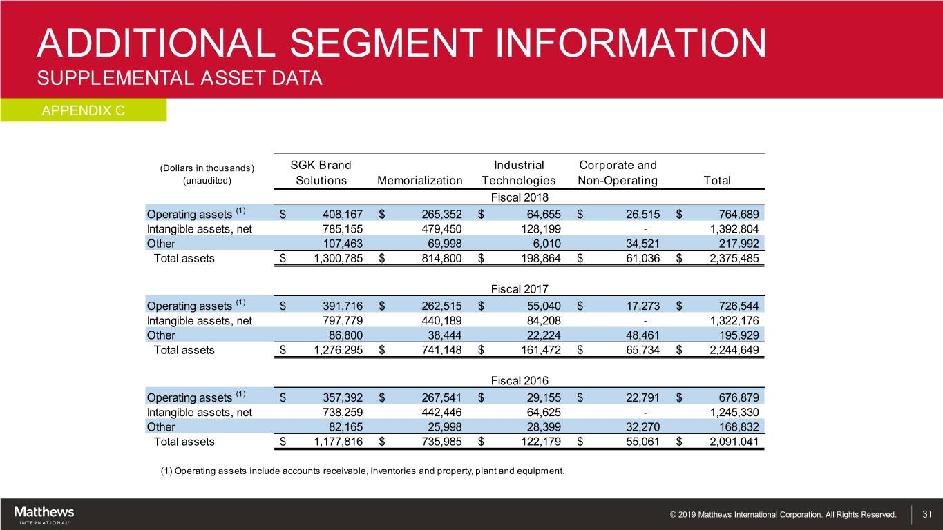 ADDITIONAL SEGMENT INFORMATION SUPPLEMENTAL ASSET DATA APPENDIX C (Dollars in thousands) SGK Brand Industrial Corporate and (unaudited) Solutions Memorialization Technologies Non-Operating Total Fiscal 2018 Operating assets (1) $ 408,167 $ 265,352 $ 64,655 $ 26,515 $ 764,689 Intangible assets, net 785,155 479,450 128,199 - 1,392,804 Other 107,463 69,998 6,010 34,521 217,992 Total assets $ 1,300,785 $ 814,800 $ 198,864 $ 61,036 $ 2,375,485 Fiscal 2017 Operating assets (1) $ 391,716 $ 262,515 $ 55,040 $ 17,273 $ 726,544 Intangible assets, net 797,779 440,189 84,208 - 1,322,176 Other 86,800 38,444 22,224 48,461 195,929 Total assets $ 1,276,295 $ 741,148 $ 161,472 $ 65,734 $ 2,244,649 Fiscal 2016 Operating assets (1) $ 357,392 $ 267,541 $ 29,155 $ 22,791 $ 676,879 Intangible assets, net 738,259 442,446 64,625 - 1,245,330 Other 82,165 25,998 28,399 32,270 168,832 Total assets $ 1,177,816 $ 735,985 $ 122,179 $ 55,061 $ 2,091,041 (1) Operating assets include accounts receivable, inventories and property, plant and equipment. © 2019 Matthews International Corporation. All Rights Reserved. 31