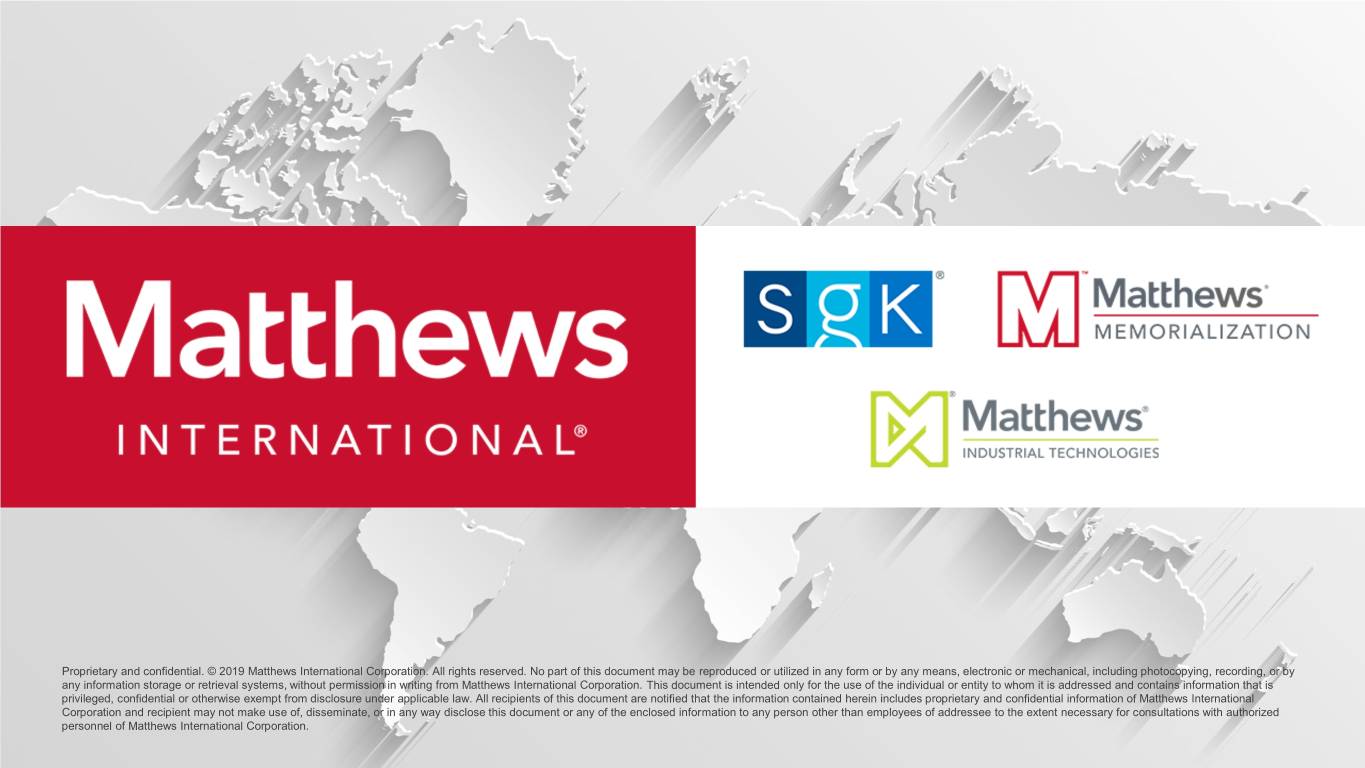 Proprietary and confidential. © 2019 Matthews International Corporation. All rights reserved. No part of this document may be reproduced or utilized in any form or by any means, electronic or mechanical, including photocopying, recording, or by any information storage or retrieval systems, without permission in writing from Matthews International Corporation. This document is intended only for the use of the individual or entity to whom it is addressed and contains information that is privileged, confidential or otherwise exempt from disclosure under applicable law. All recipients of this document are notified that the information contained herein includes proprietary and confidential information of Matthews International Corporation and recipient may not make use of, disseminate, or in any way disclose this document or any of the enclosed information to any person other than employees of addressee to the extent necessary for consultations with authorized personnel of Matthews International Corporation.