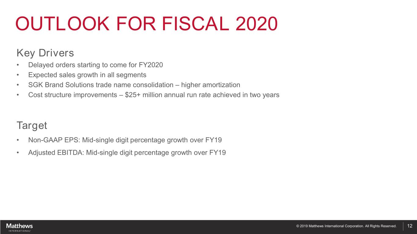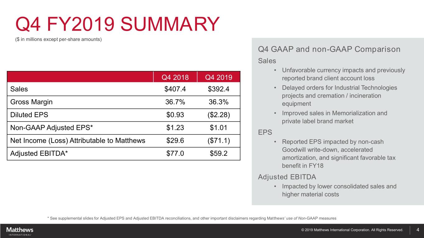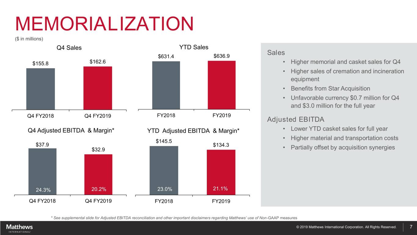 DISCLAIMER Any forward-looking statements contained in this presentation are included pursuant to the “safe harbor” provisions of the Private Securities Litigation Reform Act of 1995. Such forward-looking statements involve known and unknown risks and uncertainties that may cause the Company’s actual results in future periods to be materially different from management’s expectations. Although the Company believes that the expectations reflected in such forward-looking statements are reasonable, no assurance can be given that such expectations will prove correct. Factors that could cause the Company's results to differ materially from the results discussed in such forward-looking statements principally include changes in domestic or international economic conditions, changes in foreign currency exchange rates, changes in the cost of materials used in the manufacture of the Company's products, changes in mortality and cremation rates, changes in product demand or pricing as a result of consolidation in the industries in which the Company operates, changes in product demand or pricing as a result of domestic or international competitive pressures, ability to achieve cost- reduction objectives, unknown risks in connection with the Company's acquisitions, cybersecurity concerns, effectiveness of the Company's internal controls, compliance with domestic and foreign laws and regulations, technological factors beyond the Company's control, and other factors described in the Company’s Annual Report on Form 10-K and other periodic filings with the U.S. Securities and Exchange Commission (“SEC”). Included in this report are measures of financial performance that are not defined by generally accepted accounting principles in the United States (“GAAP”). The Company uses non-GAAP financial measures to assist in comparing its performance on a consistent basis for purposes of business decision-making by removing the impact of certain items that management believes do not directly reflect the Company’s core operations including acquisition costs, ERP integration costs, strategic initiative and other charges (which includes non-recurring charges related to operational initiatives and exit activities), stock-based compensation and the non-service portion of pension and postretirement expense. Management believes that presenting non-GAAP financial measures is useful to investors because it (i) provides investors with meaningful supplemental information regarding financial performance by excluding certain items that management believes do not directly reflect the Company’s core operations, (ii) permits investors to view performance using the same tools that management uses to budget, forecast, make operating and strategic decisions, and evaluate historical performance, and (iii) otherwise provides supplemental information that may be useful to investors in evaluating the Company’s results. The Company believes that the presentation of these non-GAAP financial measures, when considered together with the corresponding GAAP financial measures and the reconciliations to those measures, provided herein, provides investors with an additional understanding of the factors and trends affecting the Company’s business that could not be obtained absent these disclosures. The Company believes that adjusted EBITDA provides relevant and useful information, which is used by the Company’s management in assessing the performance of its business. Adjusted EBITDA is defined by the Company as earnings before interest, income taxes, depreciation, amortization and certain non-cash and/or non-recurring items that do not contribute directly to management’s evaluation of its operating results. These items include stock-based compensation, the non-service portion of pension and postretirement expense, acquisition costs, ERP integration costs, and strategic initiatives and other charges. Adjusted EBITDA provides the Company with an understanding of earnings before the impact of investing and financing charges and income taxes, and the effects of certain acquisition and ERP integration costs, and items that do not reflect the ordinary earnings of the Company’s operations. This measure may be useful to an investor in evaluating operating performance. It is also useful as a financial measure for lenders and is used by the Company’s management to measure business performance. Adjusted EBITDA is not a measure of the Company's financial performance under GAAP and should not be considered as an alternative to net income or other performance measures derived in accordance with GAAP, or as an alternative to cash flow from operating activities as a measure of the Company's liquidity. The Company's definition of adjusted EBITDA may not be comparable to similarly titled measures used by other companies. The Company has also presented adjusted net income and adjusted earnings per share and believes each measure provides relevant and useful information, which is widely used by analysts and investors, as well as by the Company’s management in assessing the performance of its business. Adjusted net income and adjusted earnings per share provides the Company with an understanding of the results from the primary operations of our business by excluding the effects of certain acquisition and system-integration costs, and items that do not reflect the ordinary earnings of our operations. These measures provide management with insight into the earning value for shareholders excluding certain costs, not related to the Company’s primary operations. Likewise, these measures may be useful to an investor in evaluating the underlying operating performance of the Company’s business overall, as well as performance trends, on a consistent basis. © 2019 Matthews International Corporation. All Rights Reserved. 2