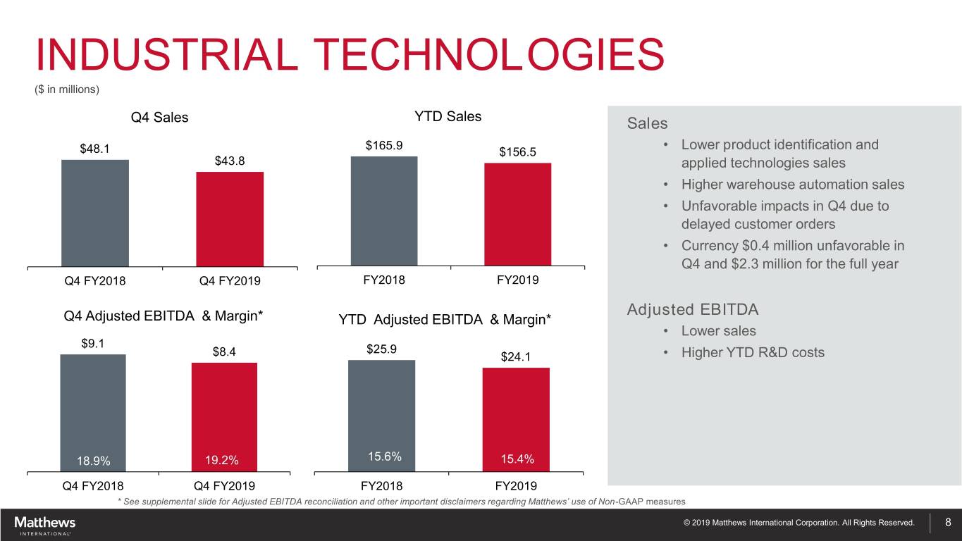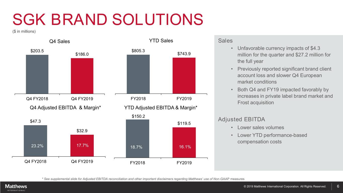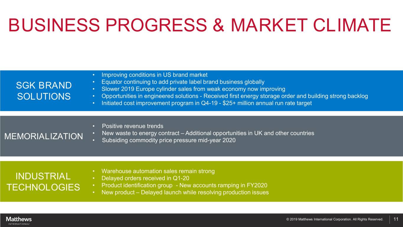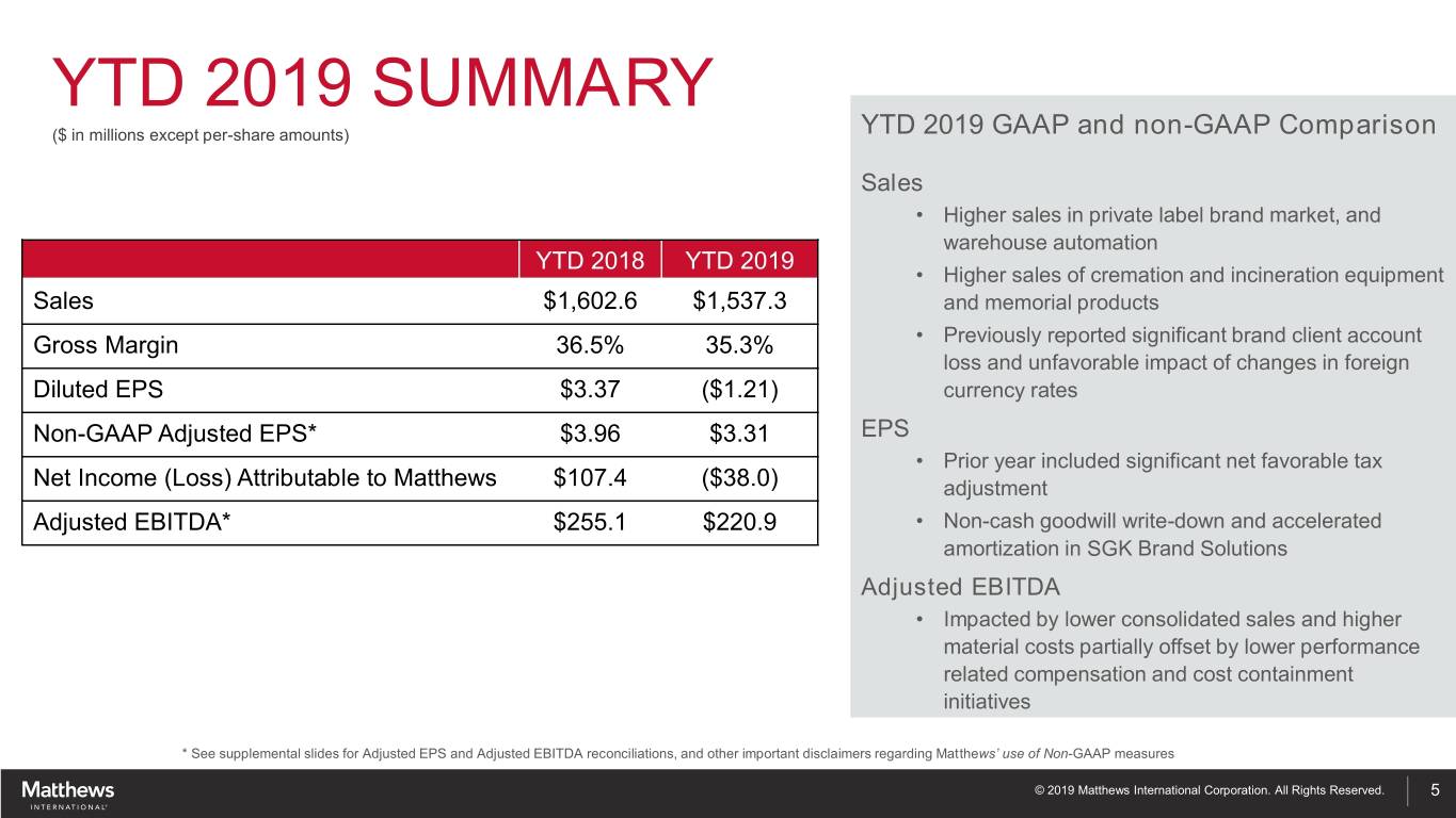 DISCLAIMER Any forward-looking statements contained in this presentation are included pursuant to the “safe harbor” provisions of the Private Securities Litigation Reform Act of 1995. Such forward-looking statements involve known and unknown risks and uncertainties that may cause the Company’s actual results in future periods to be materially different from management’s expectations. Although the Company believes that the expectations reflected in such forward-looking statements are reasonable, no assurance can be given that such expectations will prove correct. Factors that could cause the Company's results to differ materially from the results discussed in such forward-looking statements principally include changes in domestic or international economic conditions, changes in foreign currency exchange rates, changes in the cost of materials used in the manufacture of the Company's products, changes in mortality and cremation rates, changes in product demand or pricing as a result of consolidation in the industries in which the Company operates, changes in product demand or pricing as a result of domestic or international competitive pressures, ability to achieve cost- reduction objectives, unknown risks in connection with the Company's acquisitions, cybersecurity concerns, effectiveness of the Company's internal controls, compliance with domestic and foreign laws and regulations, technological factors beyond the Company's control, and other factors described in the Company’s Annual Report on Form 10-K and other periodic filings with the U.S. Securities and Exchange Commission (“SEC”). Included in this report are measures of financial performance that are not defined by generally accepted accounting principles in the United States (“GAAP”). The Company uses non-GAAP financial measures to assist in comparing its performance on a consistent basis for purposes of business decision-making by removing the impact of certain items that management believes do not directly reflect the Company’s core operations including acquisition costs, ERP integration costs, strategic initiative and other charges (which includes non-recurring charges related to operational initiatives and exit activities), stock-based compensation and the non-service portion of pension and postretirement expense. Management believes that presenting non-GAAP financial measures is useful to investors because it (i) provides investors with meaningful supplemental information regarding financial performance by excluding certain items that management believes do not directly reflect the Company’s core operations, (ii) permits investors to view performance using the same tools that management uses to budget, forecast, make operating and strategic decisions, and evaluate historical performance, and (iii) otherwise provides supplemental information that may be useful to investors in evaluating the Company’s results. The Company believes that the presentation of these non-GAAP financial measures, when considered together with the corresponding GAAP financial measures and the reconciliations to those measures, provided herein, provides investors with an additional understanding of the factors and trends affecting the Company’s business that could not be obtained absent these disclosures. The Company believes that adjusted EBITDA provides relevant and useful information, which is used by the Company’s management in assessing the performance of its business. Adjusted EBITDA is defined by the Company as earnings before interest, income taxes, depreciation, amortization and certain non-cash and/or non-recurring items that do not contribute directly to management’s evaluation of its operating results. These items include stock-based compensation, the non-service portion of pension and postretirement expense, acquisition costs, ERP integration costs, and strategic initiatives and other charges. Adjusted EBITDA provides the Company with an understanding of earnings before the impact of investing and financing charges and income taxes, and the effects of certain acquisition and ERP integration costs, and items that do not reflect the ordinary earnings of the Company’s operations. This measure may be useful to an investor in evaluating operating performance. It is also useful as a financial measure for lenders and is used by the Company’s management to measure business performance. Adjusted EBITDA is not a measure of the Company's financial performance under GAAP and should not be considered as an alternative to net income or other performance measures derived in accordance with GAAP, or as an alternative to cash flow from operating activities as a measure of the Company's liquidity. The Company's definition of adjusted EBITDA may not be comparable to similarly titled measures used by other companies. The Company has also presented adjusted net income and adjusted earnings per share and believes each measure provides relevant and useful information, which is widely used by analysts and investors, as well as by the Company’s management in assessing the performance of its business. Adjusted net income and adjusted earnings per share provides the Company with an understanding of the results from the primary operations of our business by excluding the effects of certain acquisition and system-integration costs, and items that do not reflect the ordinary earnings of our operations. These measures provide management with insight into the earning value for shareholders excluding certain costs, not related to the Company’s primary operations. Likewise, these measures may be useful to an investor in evaluating the underlying operating performance of the Company’s business overall, as well as performance trends, on a consistent basis. © 2019 Matthews International Corporation. All Rights Reserved. 2