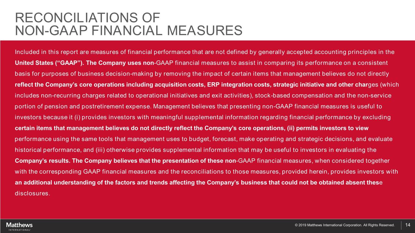 RECONCILIATIONS OF NON-GAAP FINANCIAL MEASURES Included in this report are measures of financial performance that are not defined by generally accepted accounting principles in the United States (“GAAP”). The Company uses non-GAAP financial measures to assist in comparing its performance on a consistent basis for purposes of business decision-making by removing the impact of certain items that management believes do not directly reflect the Company’s core operations including acquisition costs, ERP integration costs, strategic initiative and other charges (which includes non-recurring charges related to operational initiatives and exit activities), stock-based compensation and the non-service portion of pension and postretirement expense. Management believes that presenting non-GAAP financial measures is useful to investors because it (i) provides investors with meaningful supplemental information regarding financial performance by excluding certain items that management believes do not directly reflect the Company’s core operations, (ii) permits investors to view performance using the same tools that management uses to budget, forecast, make operating and strategic decisions, and evaluate historical performance, and (iii) otherwise provides supplemental information that may be useful to investors in evaluating the Company’s results. The Company believes that the presentation of these non-GAAP financial measures, when considered together with the corresponding GAAP financial measures and the reconciliations to those measures, provided herein, provides investors with an additional understanding of the factors and trends affecting the Company’s business that could not be obtained absent these disclosures. © 2019 Matthews International Corporation. All Rights Reserved. 14
