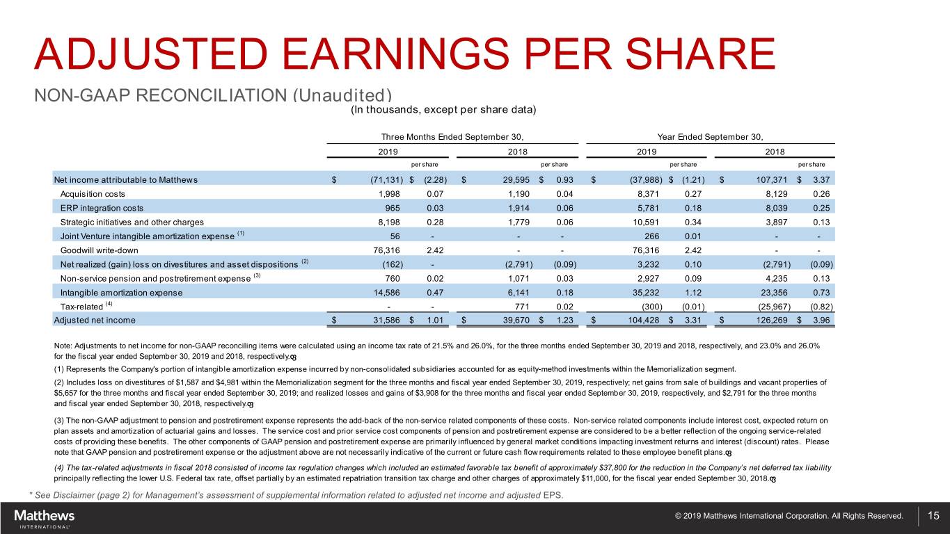 ADJUSTED EARNINGS PER SHARE NON-GAAP RECONCILIATION (Unaudited) (In thousands, except per share data) Three Months Ended September 30, Year Ended September 30, 2019 2018 2019 2018 per share per share per share per share Net income attributable to Matthews $ (71,131) $ (2.28) $ 29,595 $ 0.93 $ (37,988) $ (1.21) $ 107,371 $ 3.37 Acquisition costs 1,998 0.07 1,190 0.04 8,371 0.27 8,129 0.26 ERP integration costs 965 0.03 1,914 0.06 5,781 0.18 8,039 0.25 Strategic initiatives and other charges 8,198 0.28 1,779 0.06 10,591 0.34 3,897 0.13 Joint Venture intangible amortization expense (1) 56 - - - 266 0.01 - - Goodwill write-down 76,316 2.42 - - 76,316 2.42 - - Net realized (gain) loss on divestitures and asset dispositions (2) (162) - (2,791) (0.09) 3,232 0.10 (2,791) (0.09) Non-service pension and postretirement expense (3) 760 0.02 1,071 0.03 2,927 0.09 4,235 0.13 Intangible amortization expense 14,586 0.47 6,141 0.18 35,232 1.12 23,356 0.73 Tax-related (4) - - 771 0.02 (300) (0.01) (25,967) (0.82) Adjusted net income $ 31,586 $ 1.01 $ 39,670 $ 1.23 $ 104,428 $ 3.31 $ 126,269 $ 3.96 Note: Adjustments to net income for non-GAAP reconciling items were calculated using an income tax rate of 21.5% and 26.0%, for the three months ended September 30, 2019 and 2018, respectively, and 23.0% and 26.0% for the fiscal year ended September 30, 2019 and 2018, respectively. (1) Represents the Company's portion of intangible amortization expense incurred by non-consolidated subsidiaries accounted for as equity-method investments within the Memorialization segment. (2) Includes loss on divestitures of $1,587 and $4,981 within the Memorialization segment for the three months and fiscal year ended September 30, 2019, respectively; net gains from sale of buildings and vacant properties of $5,657 for the three months and fiscal year ended September 30, 2019; and realized losses and gains of $3,908 for the three months and fiscal year ended September 30, 2019, respectively, and $2,791 for the three months and fiscal year ended September 30, 2018, respectively. (3) The non-GAAP adjustment to pension and postretirement expense represents the add-back of the non-service related components of these costs. Non-service related components include interest cost, expected return on plan assets and amortization of actuarial gains and losses. The service cost and prior service cost components of pension and postretirement expense are considered to be a better reflection of the ongoing service-related costs of providing these benefits. The other components of GAAP pension and postretirement expense are primarily influenced by general market conditions impacting investment returns and interest (discount) rates. Please note that GAAP pension and postretirement expense or the adjustment above are not necessarily indicative of the current or future cash flow requirements related to these employee benefit plans. (4) The tax-related adjustments in fiscal 2018 consisted of income tax regulation changes which included an estimated favorable tax benefit of approximately $37,800 for the reduction in the Company’s net deferred tax liability principally reflecting the lower U.S. Federal tax rate, offset partially by an estimated repatriation transition tax charge and other charges of approximately $11,000, for the fiscal year ended September 30, 2018. * See Disclaimer (page 2) for Management’s assessment of supplemental information related to adjusted net income and adjusted EPS. © 2019 Matthews International Corporation. All Rights Reserved. 15