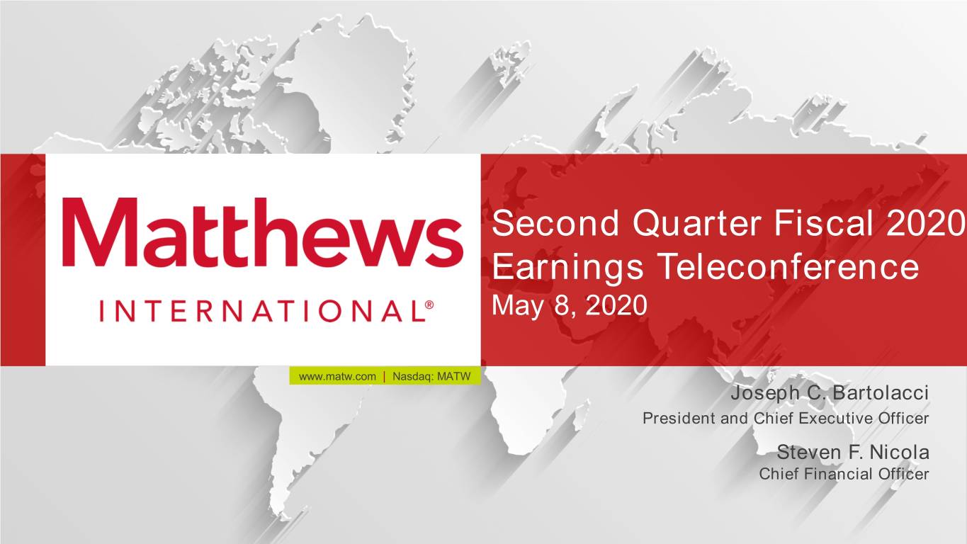 Second Quarter Fiscal 2020 Earnings Teleconference May 8, 2020 www.matw.com | Nasdaq: MATW Joseph C. Bartolacci President and Chief Executive Officer Steven F. Nicola Chief Financial Officer