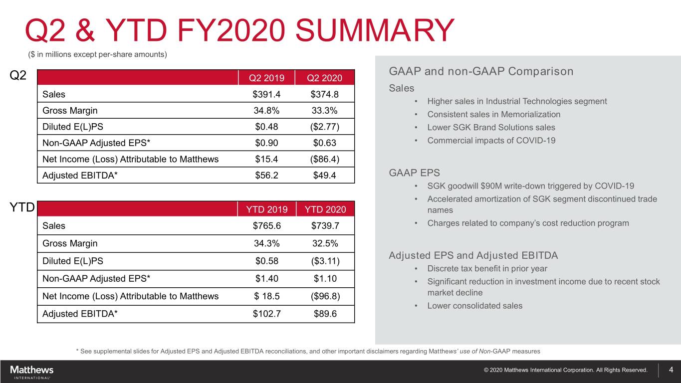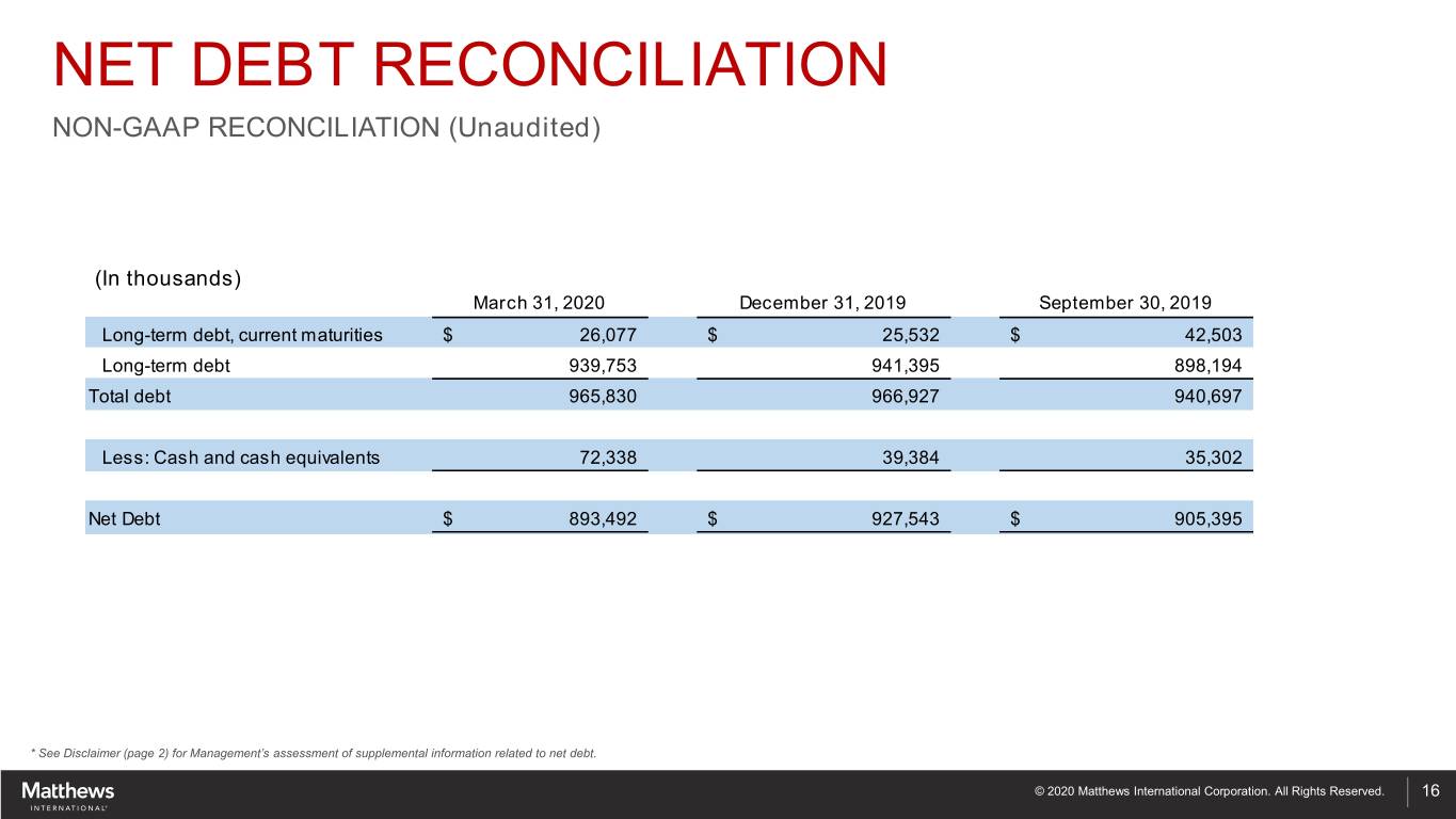 ADJUSTED EBITDA (Unaudited) Three Months Ended March 31, Six Months Ended March 31, (InIn thousands) thousands 2020 2019 2020 2019 Net (loss) income $ (86,595) $ 15,194 $ (96,901) $ 18,178 Income tax (benefit) provision (11,066) (165) (16,463) 440 (Loss) income before income taxes (97,661) 15,029 (113,364) 18,618 Net loss attributable to noncontrolling interests 231 223 71 336 Interest expense 9,613 10,259 18,853 20,560 Depreciation and amortization * 29,317 21,050 58,250 40,276 Acquisition costs (1)** 660 3,374 2,608 5,406 ERP integration costs (2)** 750 1,805 1,415 3,982 Strategic initiatives and other charges (3)** 9,219 2,112 19,470 2,112 Loss on divestiture (4) - - - 4,465 Joint Venture depreciation, amortization, interest expense and other charges (5) 1,462 - 2,259 - Non-recurring / incremental COVID-19 costs (6) 663 - 663 - Goodwill write-down (7) 90,408 - 90,408 - Stock-based compensation 2,508 1,366 4,539 5,013 Non-service pension and postretirement expense (8) 2,227 970 4,455 1,901 Total Adjusted EBITDA $ 49,397 $ 56,188 $ 89,627 $ 102,669 Adjusted EBITDA margin 13.2% 14.4% 12.1% 13.4% (1) Includes certain non-recurring costs associated with recent acquisition activities. (2) Represents costs associated with global ERP system integration efforts. (3) Includes certain non-recurring costs associated with productivity and cost-reduction initiatives intended to result in improved operating performance, profitability and working capital levels. (4) Represents a loss on the sale of a controlling interest in a subsidiary within the Memorialization segment. (5) Represents the Company's portion of depreciation, intangible amortization, interest expense, and other non-recurring charges incurred by non-consolidated subsidiaries accounted for as equity-method investments within the Memorialization segment. (6) Includes certain non-recurring direct incremental costs (such as costs for purchases of computer peripherals and devices to facilitate working-from-home, additional personal protective equipment and cleaning supplies and services, etc.) incurred in response to COVID-19. This amount does not include the impact of any lost sales or underutilization due to COVID-19. (7) Represents the goodwill write-down for two reporting units within the SGK Brand Solutions segment. (8) Non-service pension and postretirement expense includes interest cost, expected return on plan assets and amortization of actuarial gains and losses. These benefit cost components are excluded from adjusted EBITDA since they are primarily influenced by external market conditions that impact investment returns and interest (discount) rates. The service cost and prior service cost components of pension and postretirement expense are included in the calculation of adjusted EBITDA, since they are considered to be a better reflection of the ongoing service-related costs of providing these benefits. Please note that GAAP pension and postretirement expense or the adjustment above are not necessarily indicative of the current or future cash flow requirements related to these employee benefit plans. * Depreciation and amortization was $21,785 and $13,165 for the SGK Brand Solutions segment, $4,839 and $5,039 for the Memorialization segment, $1,428 and $1,559 for the Industrial Technologies segment, and $1,265 and $1,287 for Corporate and Non-Operating, for the three months ended March 31, 2020 and 2019, respectively. Depreciation and amortization was $43,441 and $24,607 for the SGK Brand Solutions segment, $9,475 and $10,058 for the Memorialization segment, $2,870 and $3,085 for the Industrial Technologies segment, and $2,464 and $2,526 for Corporate and Non-Operating, for the six months ended March 31, 2020 and 2019, respectively. ** Acquisition costs, ERP integration costs, and strategic initiatives and other charges were $3,818 and $2,808 for the SGK Brand Solutions segment and $5,813 and $4,483 for Corporate and Non-Operating, for the three months ended March 31, 2020 and 2019, respectively. Acquisition costs, ERP integration costs, and strategic initiatives and other charges were $730 for the Memorialization segment and $268 for the Industrial Technologies segment, for the three months ended March 31, 2020. Acquisition costs, ERP integration costs, and strategic initiatives and other charges were $7,264 and $3,409 for the SGK Brand Solutions segment and $14,904 and $8,091 for Corporate and Non-Operating, for the six months ended March 31, 2020 and 2019, respectively. Acquisition costs, ERP integration costs, and strategic initiatives and other charges were $1,057 for the Memorialization segment and $268 for the Industrial Technologies segment, for the six months ended March 31, 2020. * See Disclaimer (page 2) for Management’s assessment of supplemental information related to adjusted EBITDA. © 2020 Matthews International Corporation. All Rights Reserved. 15