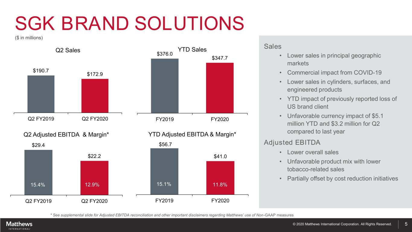 Q2 & YTD FY2020 SUMMARY ($ in millions except per-share amounts) GAAP and non-GAAP Comparison Q2 Q2 2019 Q2 2020 Sales Sales $391.4 $374.8 • Higher sales in Industrial Technologies segment Gross Margin 34.8% 33.3% • Consistent sales in Memorialization Diluted E(L)PS $0.48 ($2.77) • Lower SGK Brand Solutions sales Non-GAAP Adjusted EPS* $0.90 $0.63 • Commercial impacts of COVID-19 Net Income (Loss) Attributable to Matthews $15.4 ($86.4) Adjusted EBITDA* $56.2 $49.4 GAAP EPS • SGK goodwill $90M write-down triggered by COVID-19 • Accelerated amortization of SGK segment discontinued trade YTD YTD 2019 YTD 2020 names Sales $765.6 $739.7 • Charges related to company’s cost reduction program Gross Margin 34.3% 32.5% Adjusted EPS and Adjusted EBITDA Diluted E(L)PS $0.58 ($3.11) • Discrete tax benefit in prior year Non-GAAP Adjusted EPS* $1.40 $1.10 • Significant reduction in investment income due to recent stock Net Income (Loss) Attributable to Matthews $ 18.5 ($96.8) market decline • Lower consolidated sales Adjusted EBITDA* $102.7 $89.6 * See supplemental slides for Adjusted EPS and Adjusted EBITDA reconciliations, and other important disclaimers regarding Matthews’ use of Non-GAAP measures © 2020 Matthews International Corporation. All Rights Reserved. 4