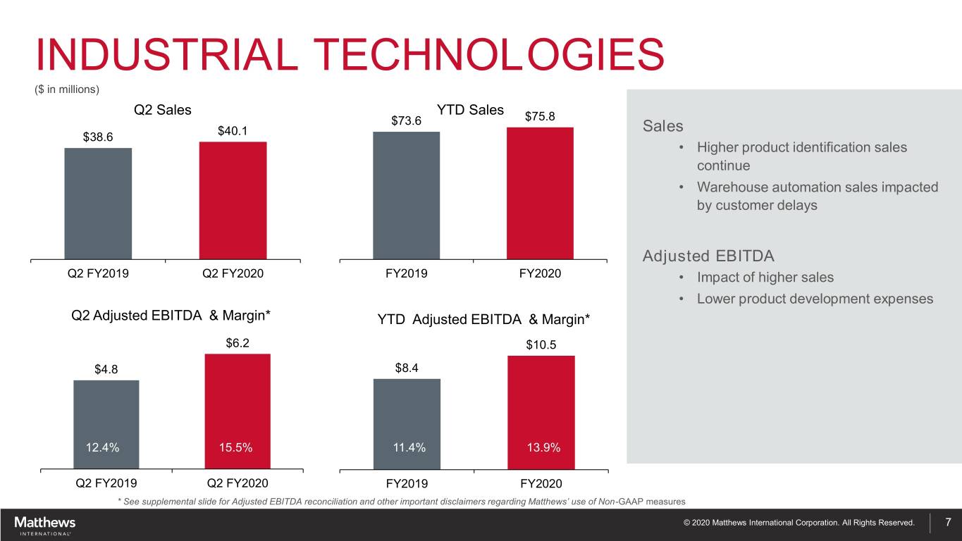 MEMORIALIZATION ($ in millions) Q2 Sales YTD Sales Sales $162.2 $161.8 $316.1 $316.2 • Higher cremation and incineration equipment sales • Improved price realization offset by lower unit volume • International memorial product sales unfavorably impacted by COVID-19 in Q2 Q2 FY2019 Q2 FY2020 FY2019 FY2020 Q2 Adjusted EBITDA & Margin* YTD Adjusted EBITDA & Margin* Adjusted EBITDA $35.0 $35.2 $65.3 $65.3 • YTD benefits of productivity offset by higher material and freight costs 23.0% 21.1% 21.6% 21.7% 20.7% 20.6% Q2 FY2019 Q2 FY2020 FY2019 FY2020 * See supplemental slide for Adjusted EBITDA reconciliation and other important disclaimers regarding Matthews’ use of Non-GAAP measures © 2020 Matthews International Corporation. All Rights Reserved. 6