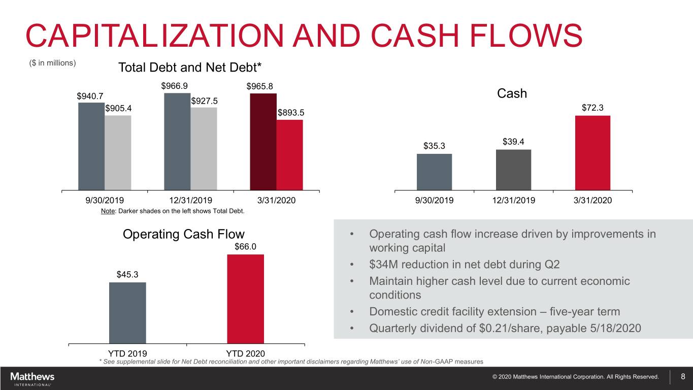 INDUSTRIAL TECHNOLOGIES ($ in millions) Q2 Sales YTD Sales $73.6 $75.8 $40.1 Sales $38.6 • Higher product identification sales continue • Warehouse automation sales impacted by customer delays Adjusted EBITDA Q2 FY2019 Q2 FY2020 FY2019 FY2020 • Impact of higher sales • Lower product development expenses Q2 Adjusted EBITDA & Margin* YTD Adjusted EBITDA & Margin* $6.2 $10.5 $4.8 $8.4 12.4% 15.5% 11.4% 13.9% 15.5% 12.4% 15.6%10.3% Q2 FY2019 Q2 FY2020 FY2019 FY2020 * See supplemental slide for Adjusted EBITDA reconciliation and other important disclaimers regarding Matthews’ use of Non-GAAP measures © 2020 Matthews International Corporation. All Rights Reserved. 7